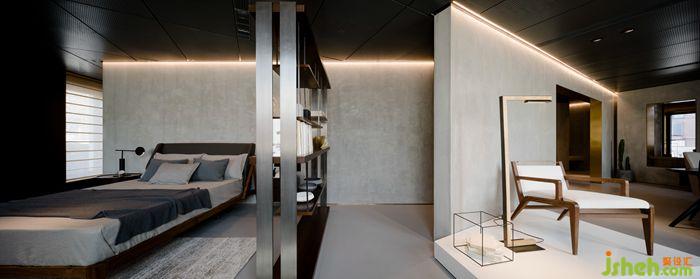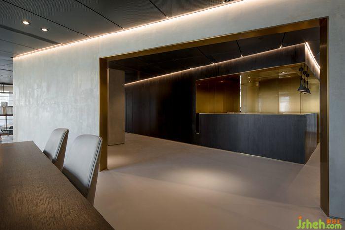 接待區(qū)設(shè)計以體塊感強化了界面,如神秘黑盒子,不僅融合原空間中核心筒結(jié)構(gòu),而且儲藏室及生活空間也一并隱藏其中。通過不同材質(zhì)搭配組合,形成視覺張力與質(zhì)感碰撞。