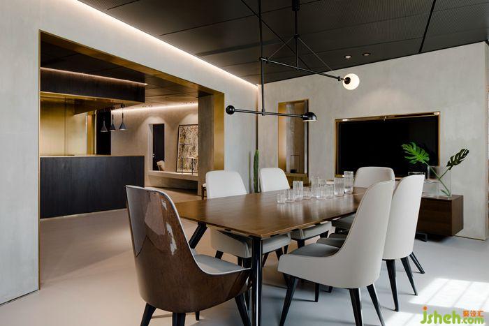 金屬套口串聯(lián)起接待區(qū)和餐廳,賦予其硬朗精致格調(diào)。桌椅柜體恬靜融入空間,360度旋轉(zhuǎn)電視可在餐廳與客廳切換自如,呈現(xiàn)變幻可塑的自由性。