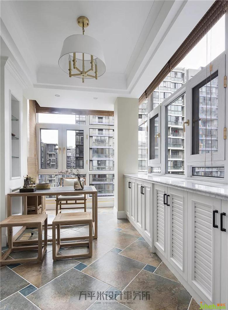 入戶花園尺寸寬敞采光良好,作為茶室待客小憩。沿窗臺一側(cè)制作儲物地柜,柜頂臺面采用大理石鋪設(shè),便于打理。茶桌一側(cè)制作開放式展示柜,以收納展示茶具茶葉等,桌下留有下水口,方便使用。