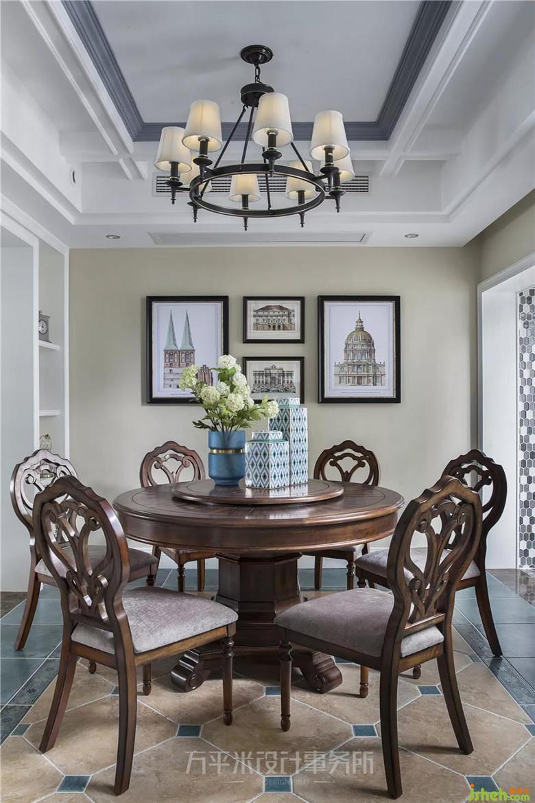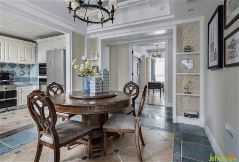 餐廳與廚房間門洞擴大開放式處理,令兩個功能區(qū)域空間延伸。對稱的開放式展示柜則組成了餐廳與過道間的寬敞門洞。