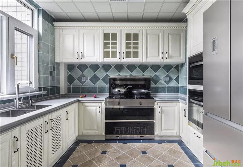 U型櫥柜與組合高柜將大尺寸廚電一一嵌入,使操作臺面寬敞,洗切炒盛動線合理便利。