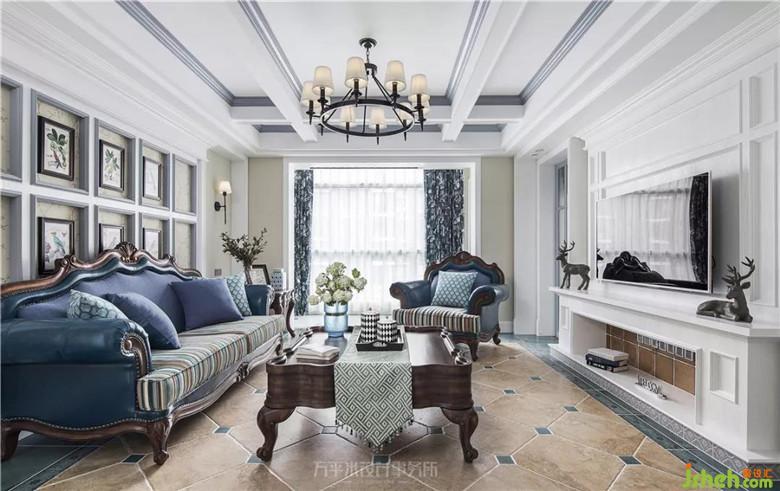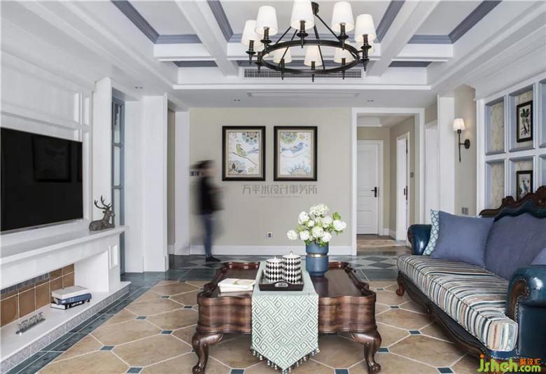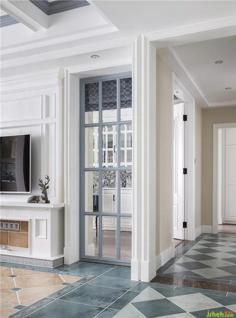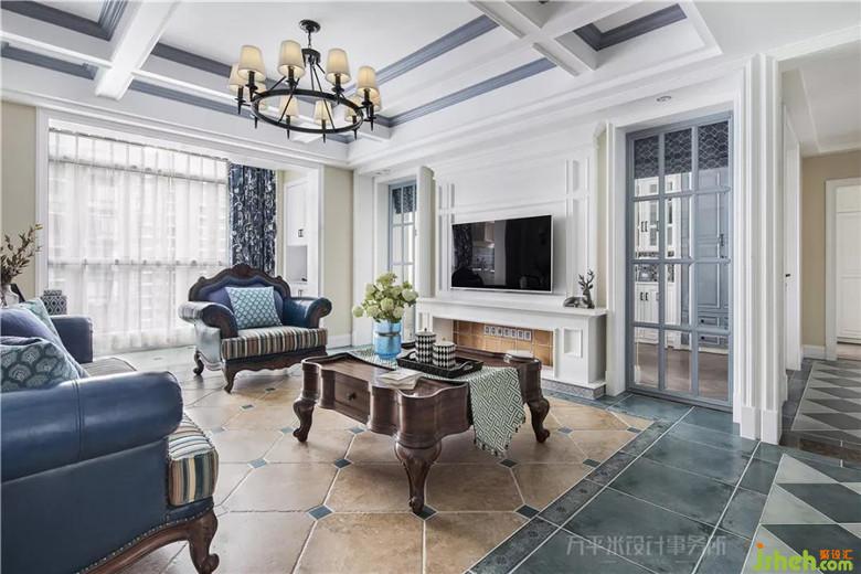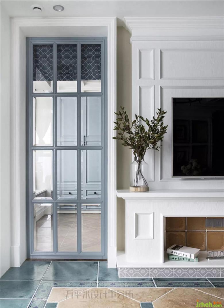 造型壁爐營造圍爐而坐的美式居家輕松氛圍。透過玻璃隔斷將書房自然采光引入客廳。裝修公司