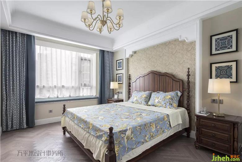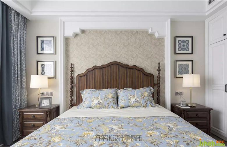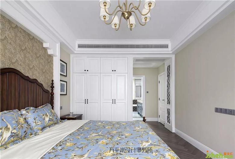 主臥套間寬敞明亮,床頭簡單立體造型將美式原木大床圍合,奶咖色云紋織錦圖案墻紙溫柔裝點(diǎn)烘托。
