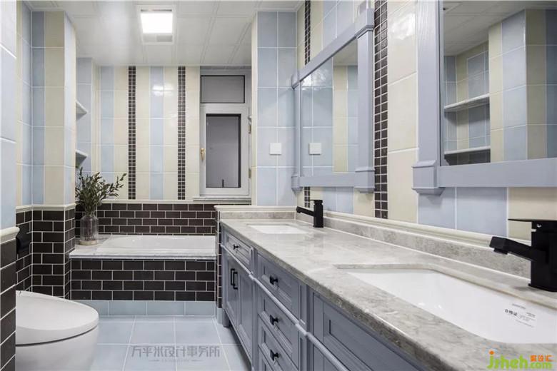 套間內(nèi)主衛(wèi)空間寬松,輕松容納浴缸及雙盆洗手臺,定制藍色原木質(zhì)嵌入式洗手臺及浴鏡,與同色系復古風情的仿古磚相映成趣。利用墻面凹凸的小空間制作出開放式大理石層板,方便收納。