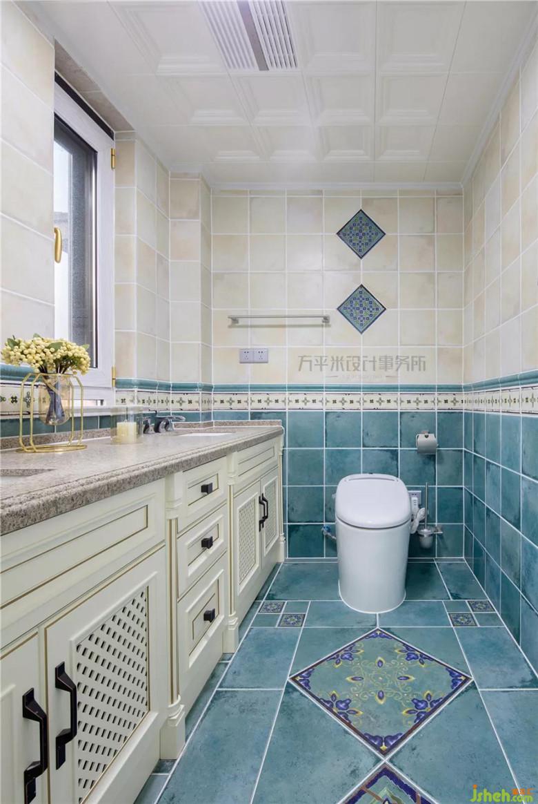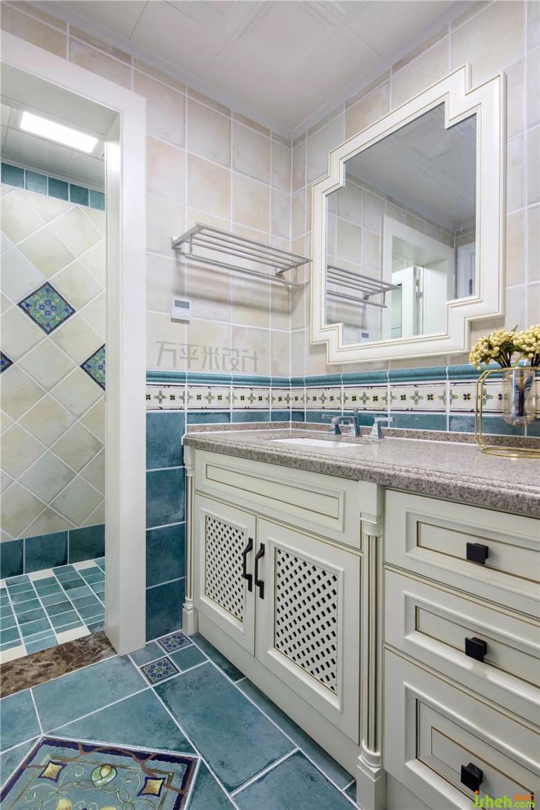 主衛(wèi)尺寸寬敞采取雙盆設(shè)計(jì),分色仿古墻磚鋪貼,烘托原木定制浴室柜。