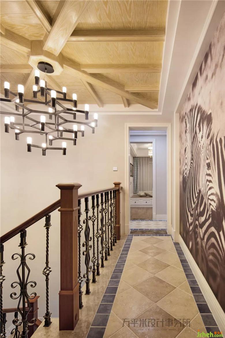 樓梯間頂部采用風(fēng)化白的原木色木質(zhì)吊頂,二樓通道處的滿墻黑白時(shí)尚噴繪,為年輕一輩的生活起居空間融入現(xiàn)代前衛(wèi)元素。