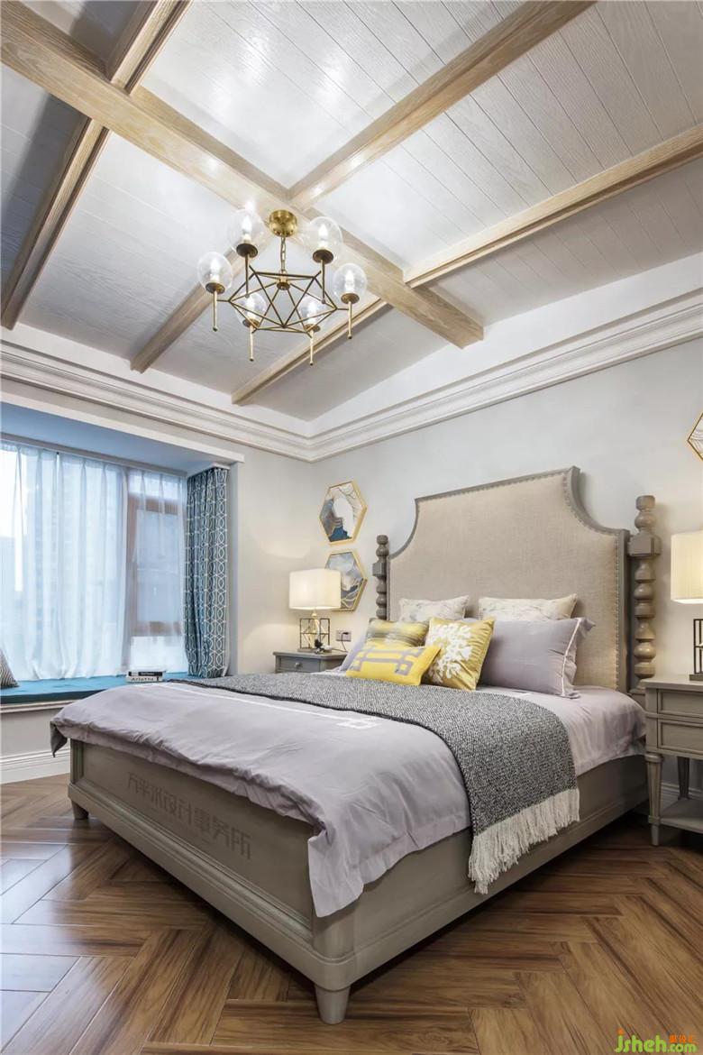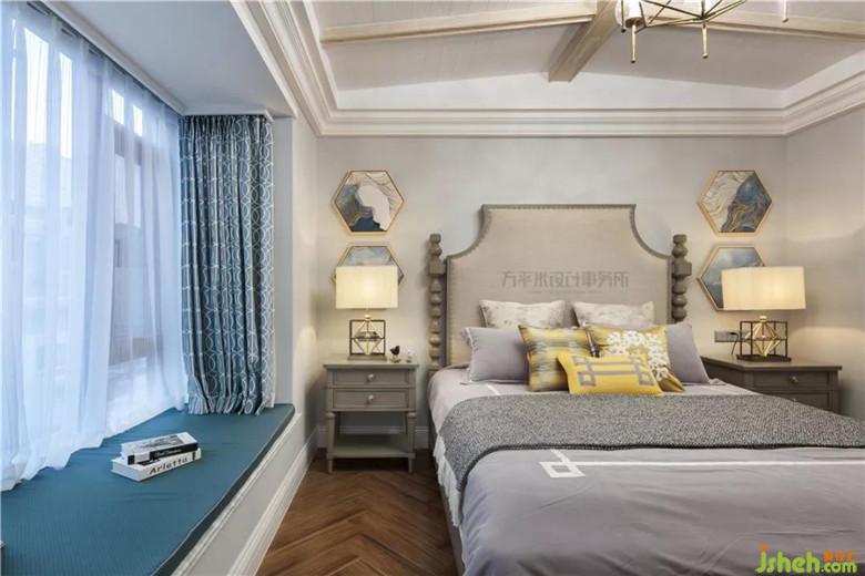 次臥為業(yè)主兒子的寬敞套間,因此在家具色彩上選用不同于主臥深咖色澤的淺灰色系,配以淺金與藍(lán)色調(diào)的布藝及裝飾品強(qiáng)調(diào)年輕活力感。