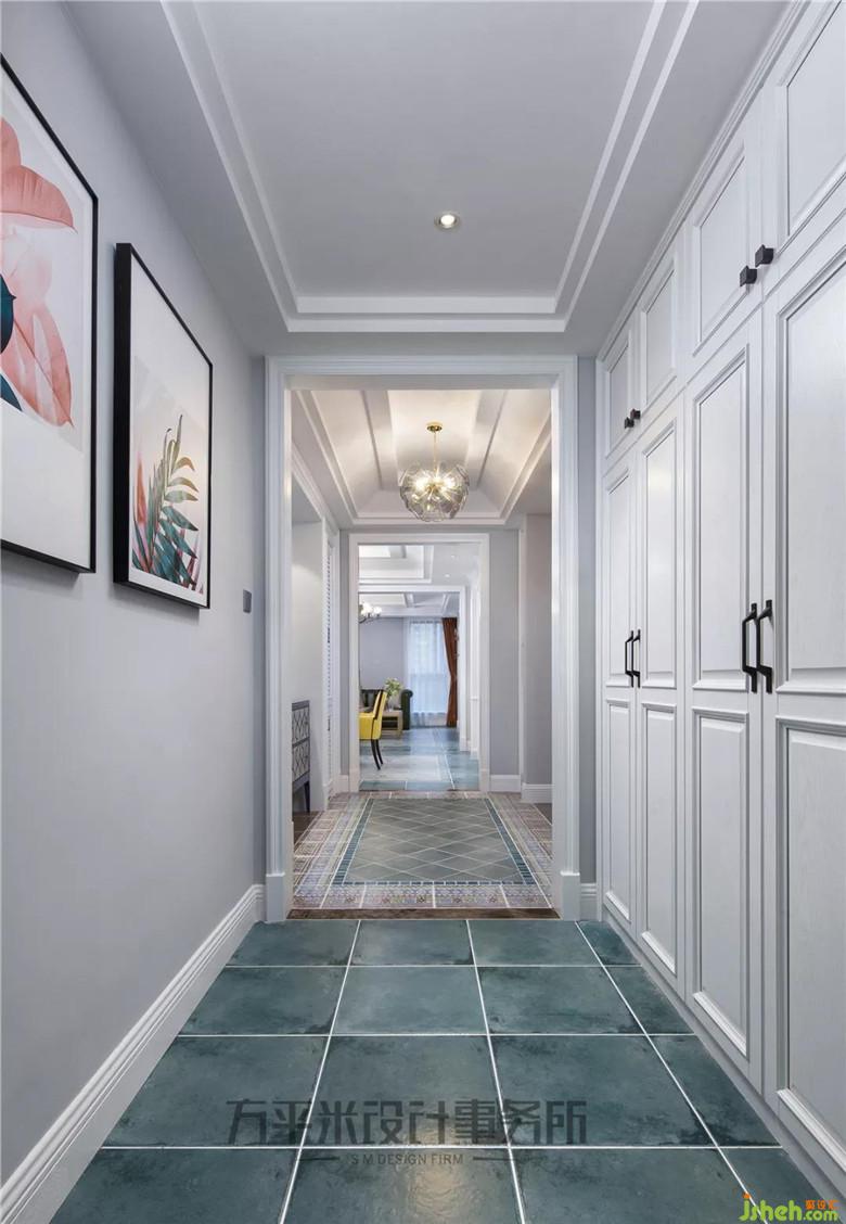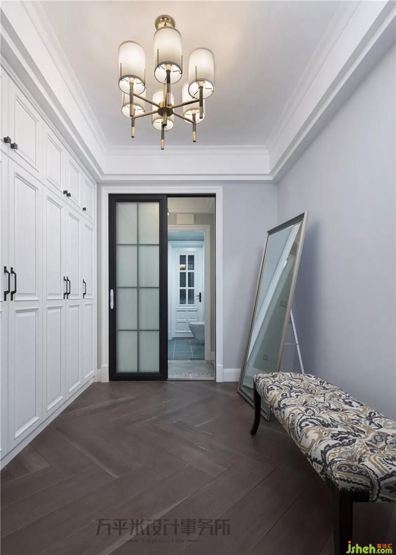 經(jīng)由拓寬的走廊步入臥室起居區(qū)域,依墻而建嵌入式儲(chǔ)物柜,將空間利用。并提升入戶門廳北向自然采光。
