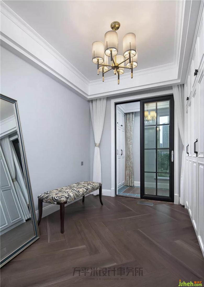 帶獨(dú)立陽(yáng)臺(tái)的多功能衣帽間,制作滿墻衣柜儲(chǔ)物收納。寬敞內(nèi)空可充當(dāng)瑜伽室使用。衣柜對(duì)側(cè)墻面預(yù)留出開(kāi)關(guān)插座,未來(lái)可放置沙發(fā)床,使房間充當(dāng)休閑客臥。