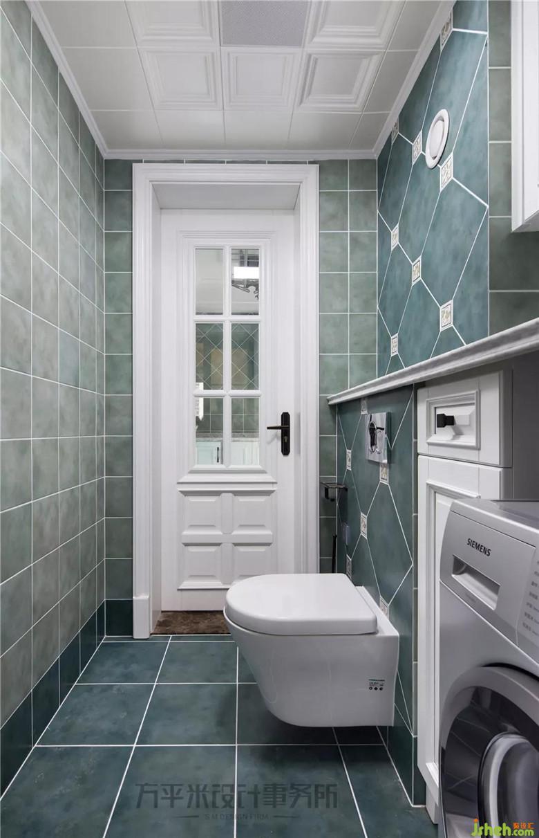 坐便器掛墻安裝便于清潔,利用嵌入式水箱形成的墻面厚度,于一側(cè)制作洗衣柜及一體臺(tái)面。