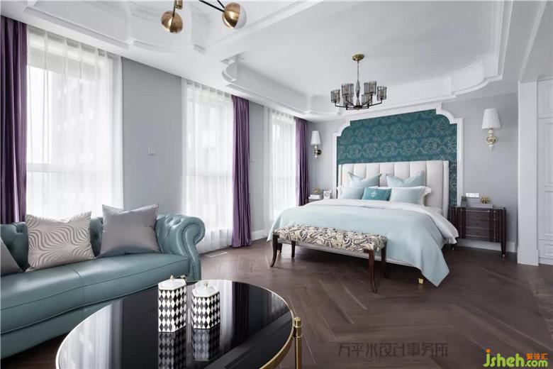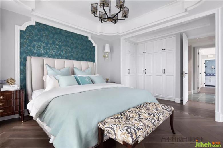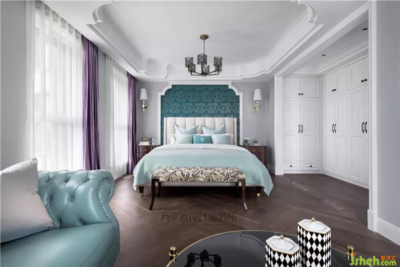 四扇落地采光窗令寬敞主臥明亮通透。L型衣帽間及床尾休閑觀影區(qū)域的開(kāi)放式布局令大宅的空間感得以呈現(xiàn)。以頂面分區(qū)造型將功能區(qū)域劃分,并隱藏原梁。
