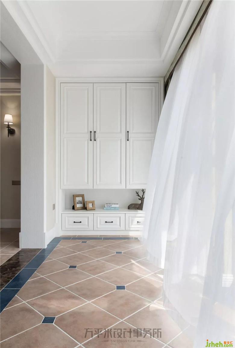 于原入戶門位置做出造型門洞,使入戶區(qū)域有所緩沖的同時(shí),加深的厚度令儲(chǔ)物鞋柜嵌入式設(shè)置,增加門廳處的收納。