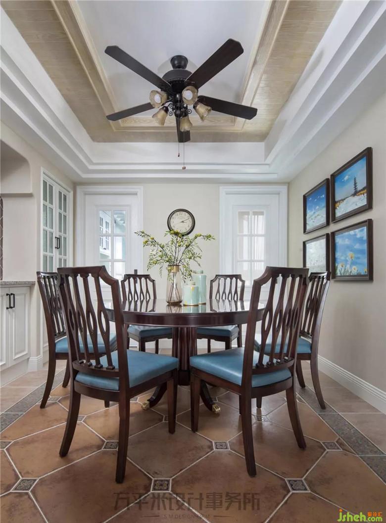 將休閑陽(yáng)臺(tái)的門(mén)洞位置調(diào)整,與廚房門(mén)洞一道,于餐廳墻面形成對(duì)稱(chēng)的美觀立面。墻面裝飾畫(huà)為女主人親筆所繪,清澄的天空主題傳遞出對(duì)純凈自然的親近之心。