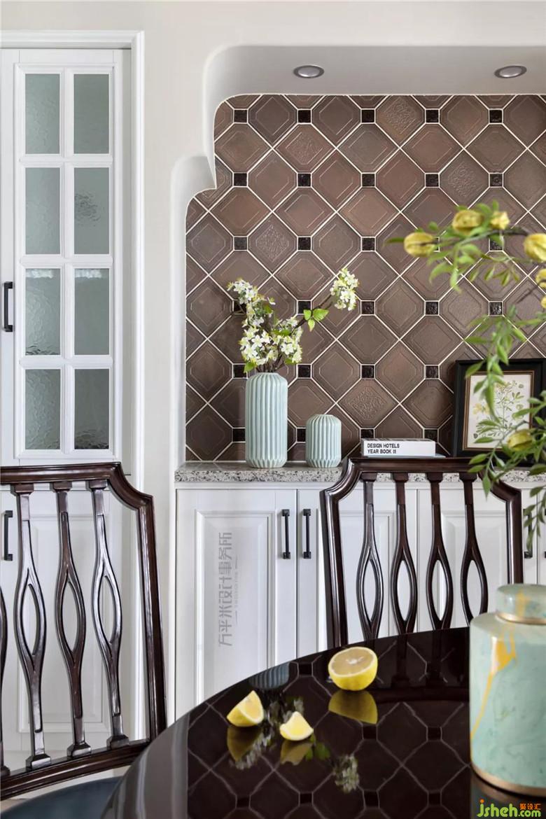 將電表箱隱藏于餐邊柜內(nèi),獲得清爽整潔的立面。與電視墻相同材質(zhì)及相似造型的使用,于相鄰空間內(nèi)有所呼應(yīng)。大理石鋪設(shè)餐邊柜臺(tái)面,便于打理。裝修公司