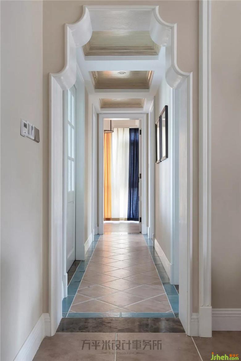 木質(zhì)優(yōu)雅弧形門(mén)洞后,是進(jìn)入臥室區(qū)域的通道。將左側(cè)多功能次臥的門(mén)洞擴(kuò)寬,寬敞移門(mén)取代原有單門(mén),并內(nèi)嵌水紋玻璃,保證臥室私密度的同時(shí),也為長(zhǎng)距離走廊引入北側(cè)自然采光。