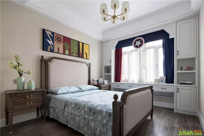 由主臥衣帽間劃分出兒童房?jī)?nèi)衣柜尺寸后,依靠明亮窗臺(tái)一側(cè),制作出一體式書(shū)柜與寬敞雙人書(shū)桌。為喜愛(ài)超級(jí)英雄的小主人,定制主題窗簾并選配對(duì)應(yīng)裝飾畫(huà)。