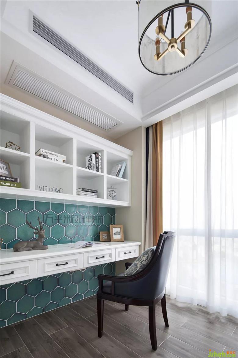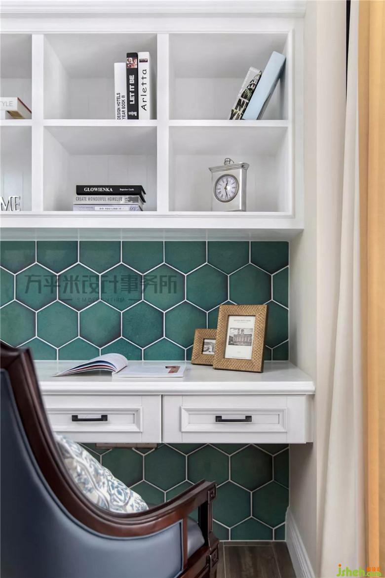 獨(dú)立書房擁有整面落地采光窗,房屋視線通透采光良好,為愜意私密閱讀空間。開放式書架及固定式書桌風(fēng)格統(tǒng)一,底面采用孔雀綠手工磚,便于打理。