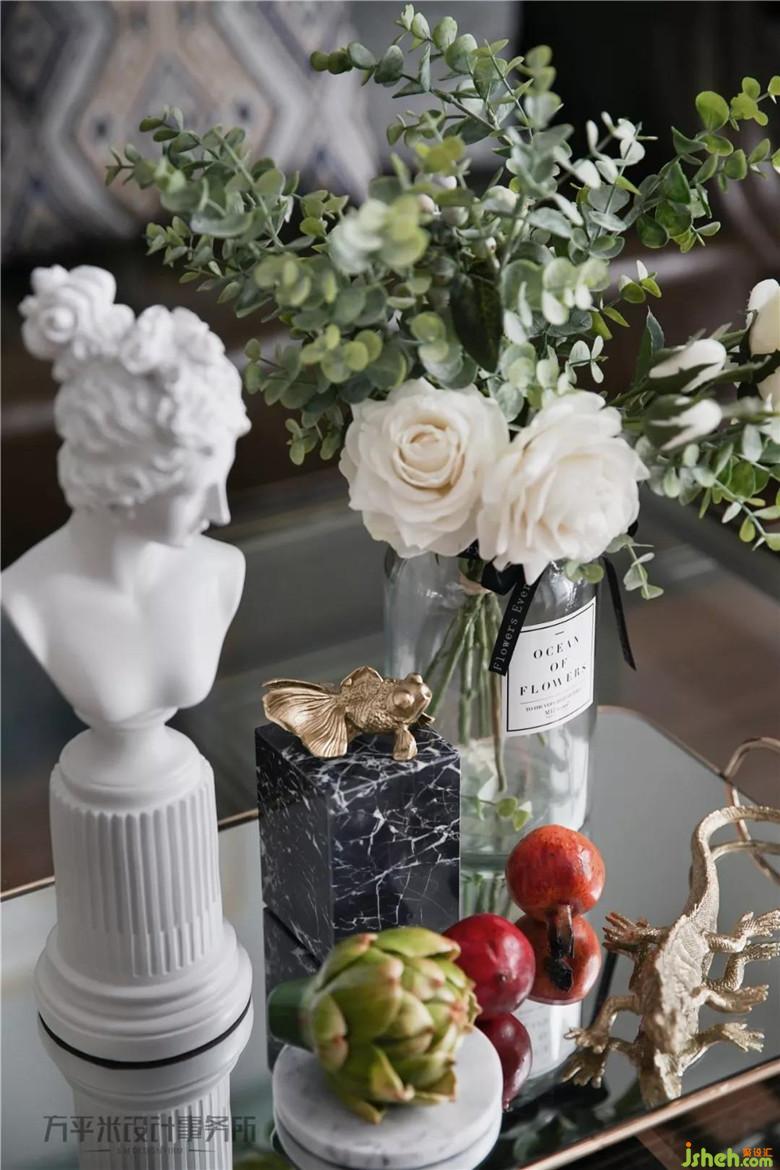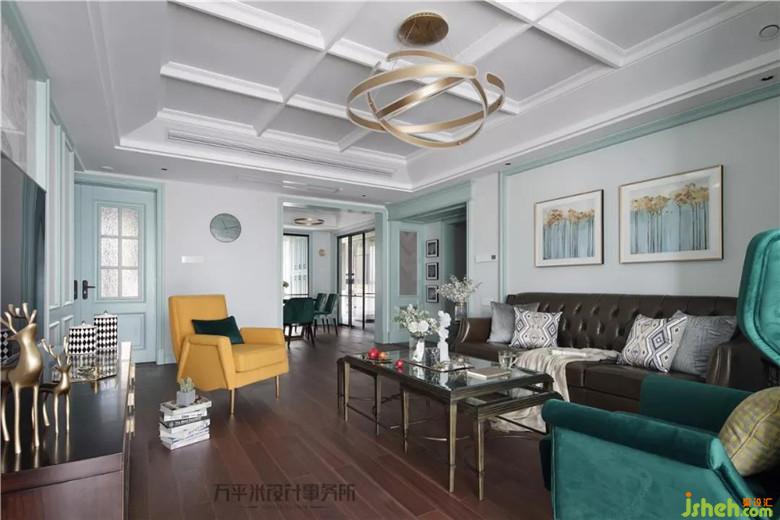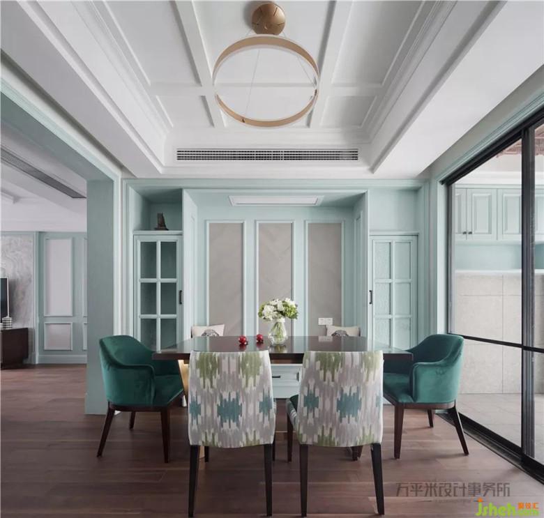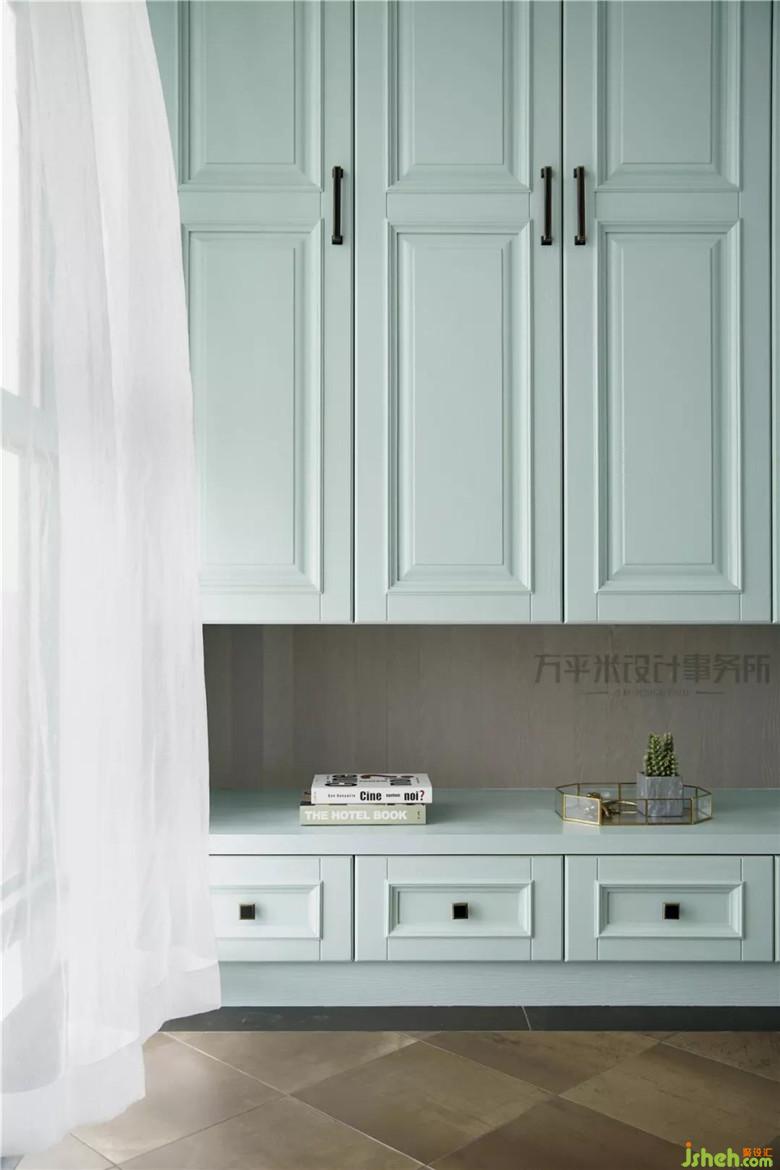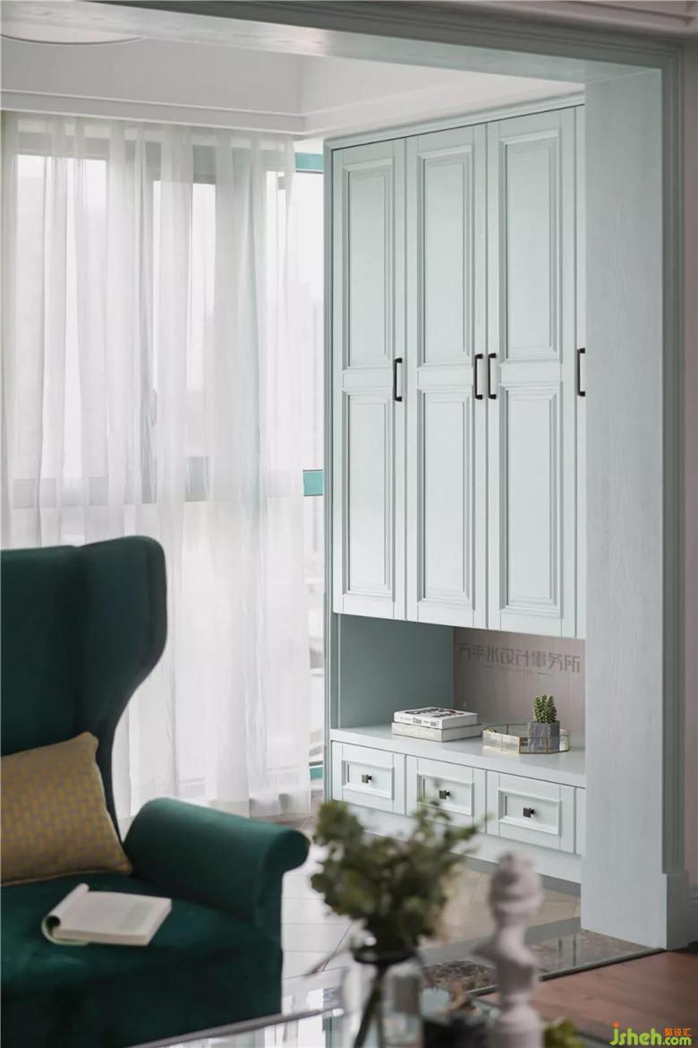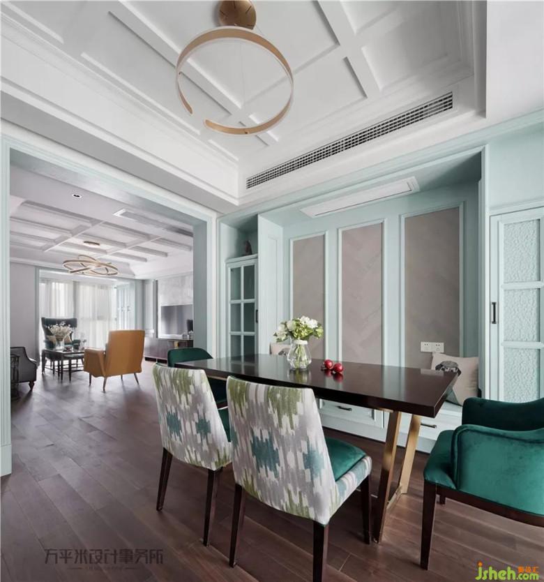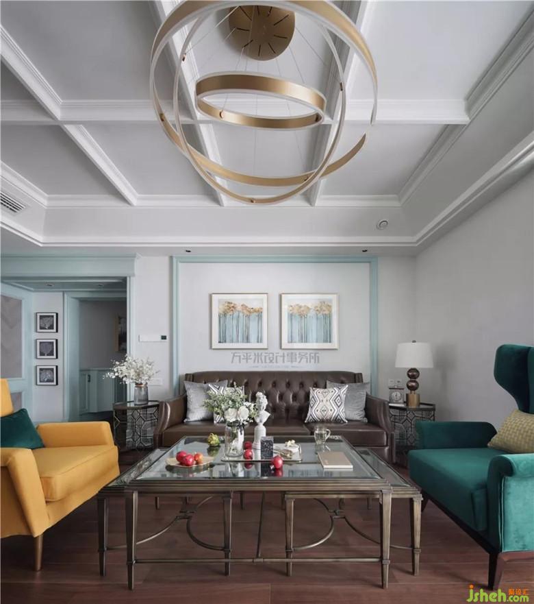 金屬質(zhì)感及獨(dú)特環(huán)狀立體照明的主燈選擇,使現(xiàn)代設(shè)計(jì)感充盈于美式傳統(tǒng)典雅。絲絨質(zhì)感的復(fù)古綠色與薄荷色調(diào)形成漸進(jìn)的色彩層次。景觀陽臺作為客廳延伸,提升全屋視線景觀及通風(fēng)采光。