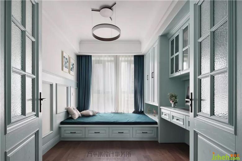 寬敞榻榻米與一體式儲(chǔ)物柜書桌組合,使房間可作為書房、活動(dòng)室、及客臥使用。床尾部分儲(chǔ)物柜加深厚度提升收納功能。窗簾及軟墊的墨綠色沿用公共區(qū)域色彩搭配方式。