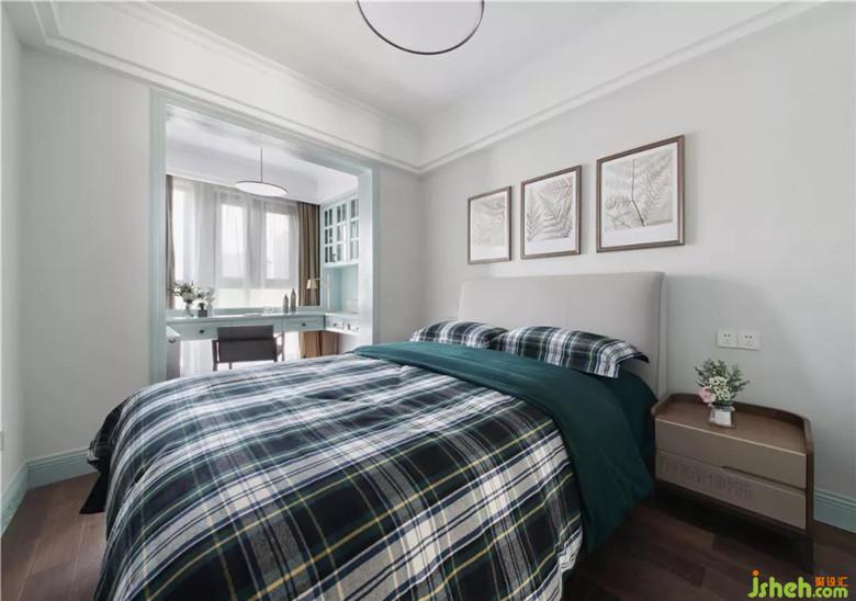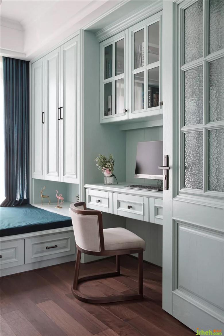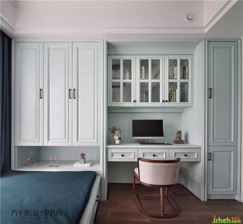寬松尺寸令開門與否都可自如使用書桌。床尾留空令空間感有所延伸不顯壓抑。公衛(wèi)干區(qū)定制浴室柜兩側(cè)沿用玄關(guān)柜相似弧度造型,解決臺(tái)盆安裝尺寸與柜體右側(cè)收口之間的矛盾。鏡柜設(shè)計(jì)提升收納,可使臺(tái)面保持整潔清爽。
