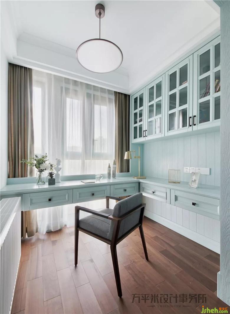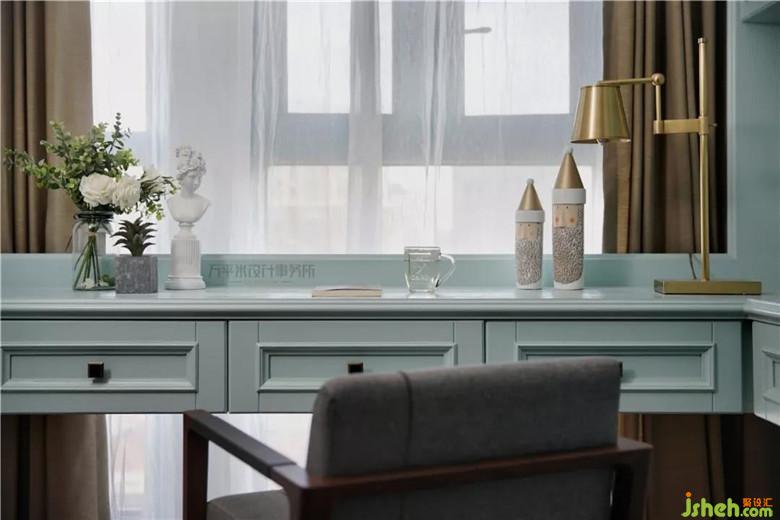 南面兒童房利用主臥原衣帽間一分為二的空間,制作內(nèi)嵌式衣柜。將原有景觀陽臺的小面積并入,成為套間內(nèi)的小書房。臨窗光線充足,現(xiàn)場制作的L型大書桌,寬敞桌面便于使用。貼心設(shè)置的小擋板防物品滾落。