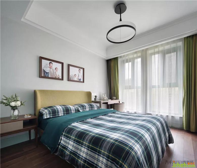 北面兒童房原始尺寸較為寬敞,于靠窗明亮放置書桌椅。窗簾與床選用相同的溫柔草綠色,互為呼應(yīng)。