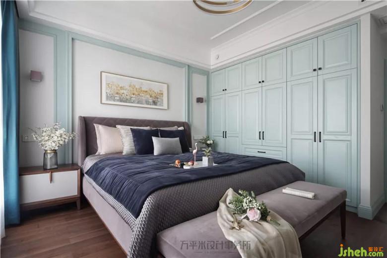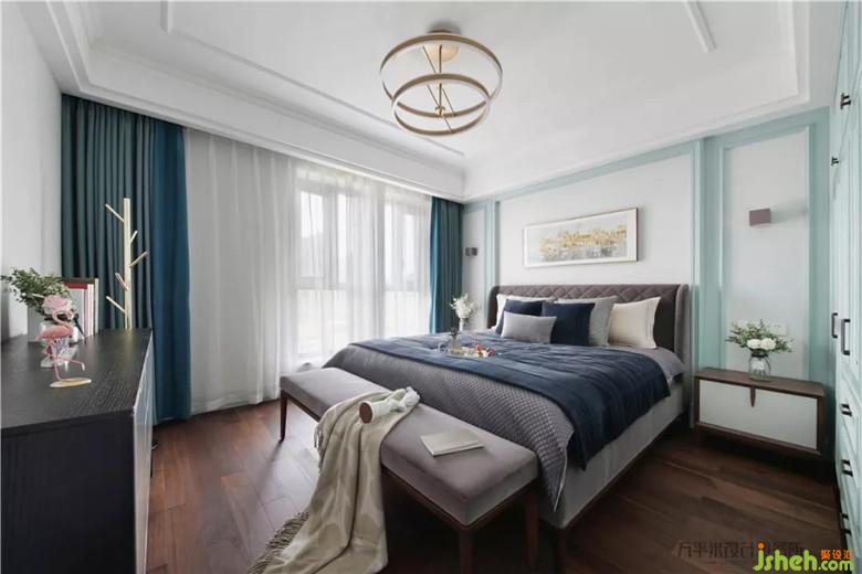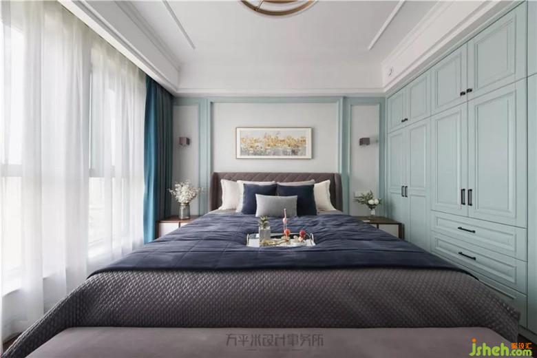 深青藍色調(diào)的主臥營造寧靜安心的睡眠環(huán)境。簡單的線框?qū)⒋差^加以圍鑲。