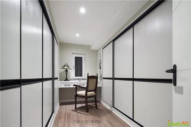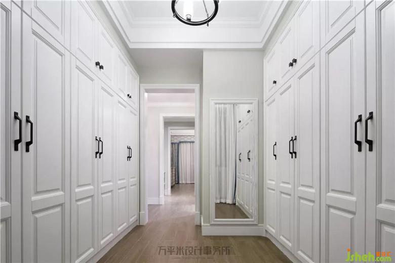 輕柔色彩及幾何圖案的使用,令整體散發(fā)出一種知性的中性美感。床尾一側擺放斗柜。主臥套間內獨立衣帽間。