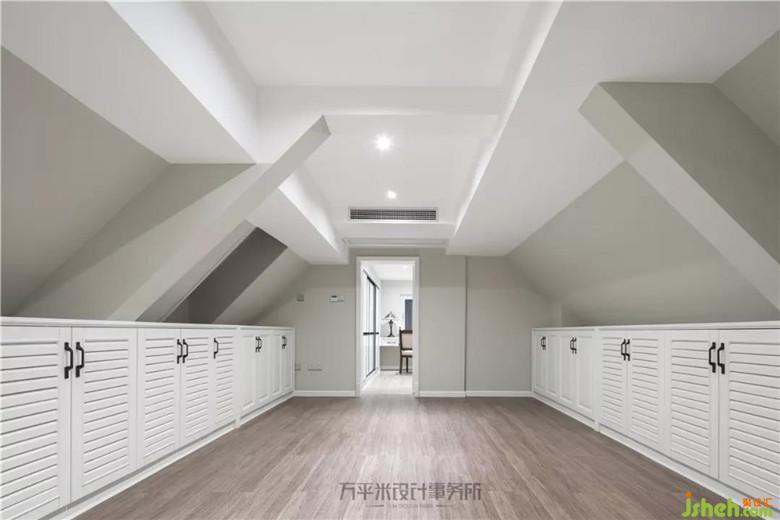 三層為原本贈送的尖屋頂挑空區(qū)域,現(xiàn)澆樓面后作為瑜伽及儲物間使用。兩側斜角位置制作對稱的地柜儲物。中間寬敞區(qū)域為瑜伽區(qū)。獨立儲物間,臨窗處設置小書桌,使得房間也可變?yōu)閹в惺釆y臺的衣帽間。