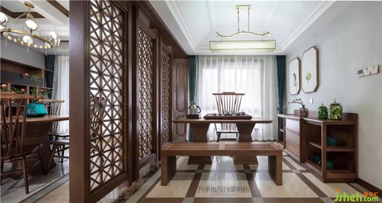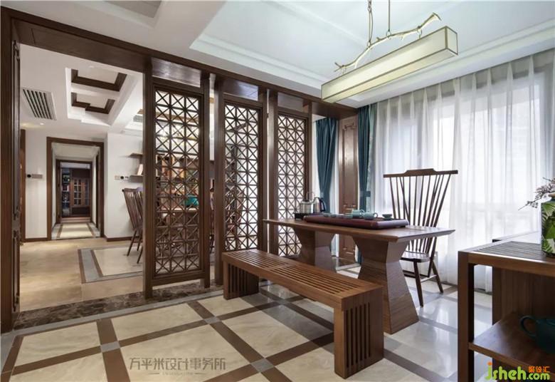 經(jīng)由門廳進(jìn)入茶室,將房間原始隔墻取消,以并列的三扇屏風(fēng)取代,定制的原木鏤空屏風(fēng)兩側(cè)均留有通道,環(huán)形動(dòng)線出入無拘。