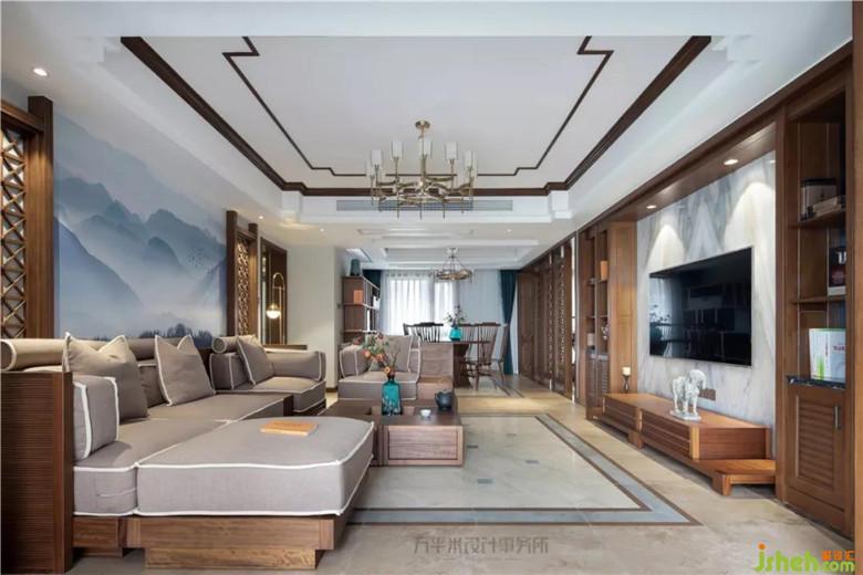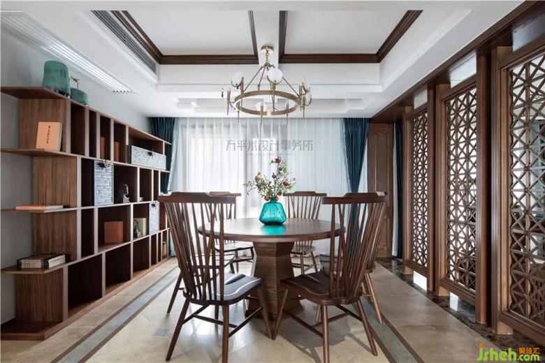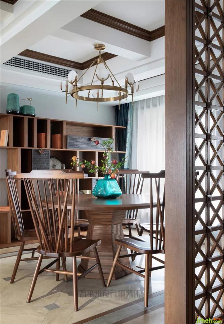 因隔墻拆除,屏風(fēng)位置后移調(diào)整,令餐廳縱向空間變大,可輕松容納餐邊柜尺寸;利用地磚拼花位置,從視覺上橫向借用過道面積,并通過對(duì)應(yīng)頂面對(duì)稱地面調(diào)整,平衡空間。木質(zhì)竹節(jié)雕花柜門與淡青竹葉隱花窗簾相得益彰,取青翠沉靜色彩平衡大量木質(zhì)暖色調(diào),取竹之君子品德寓意高雅堅(jiān)韌。