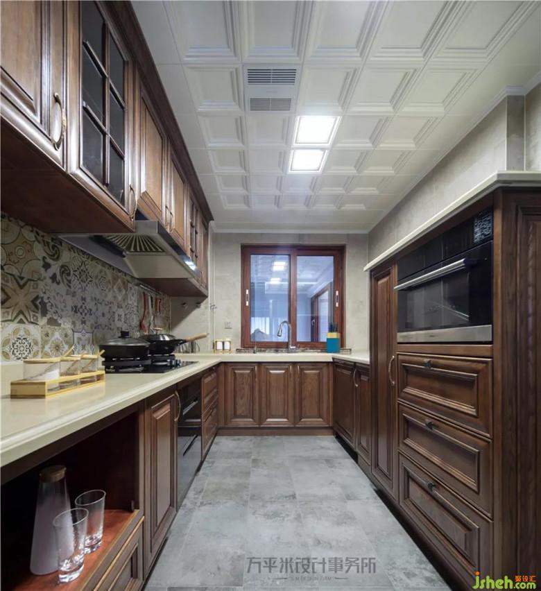 廚房U型櫥柜設(shè)計(jì)以最大利用空間,因中部通道尺寸并不十分寬敞,因此右側(cè)設(shè)置半高柜將電器嵌入式安裝,頂部留空保留兩側(cè)的空間感。