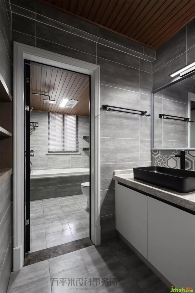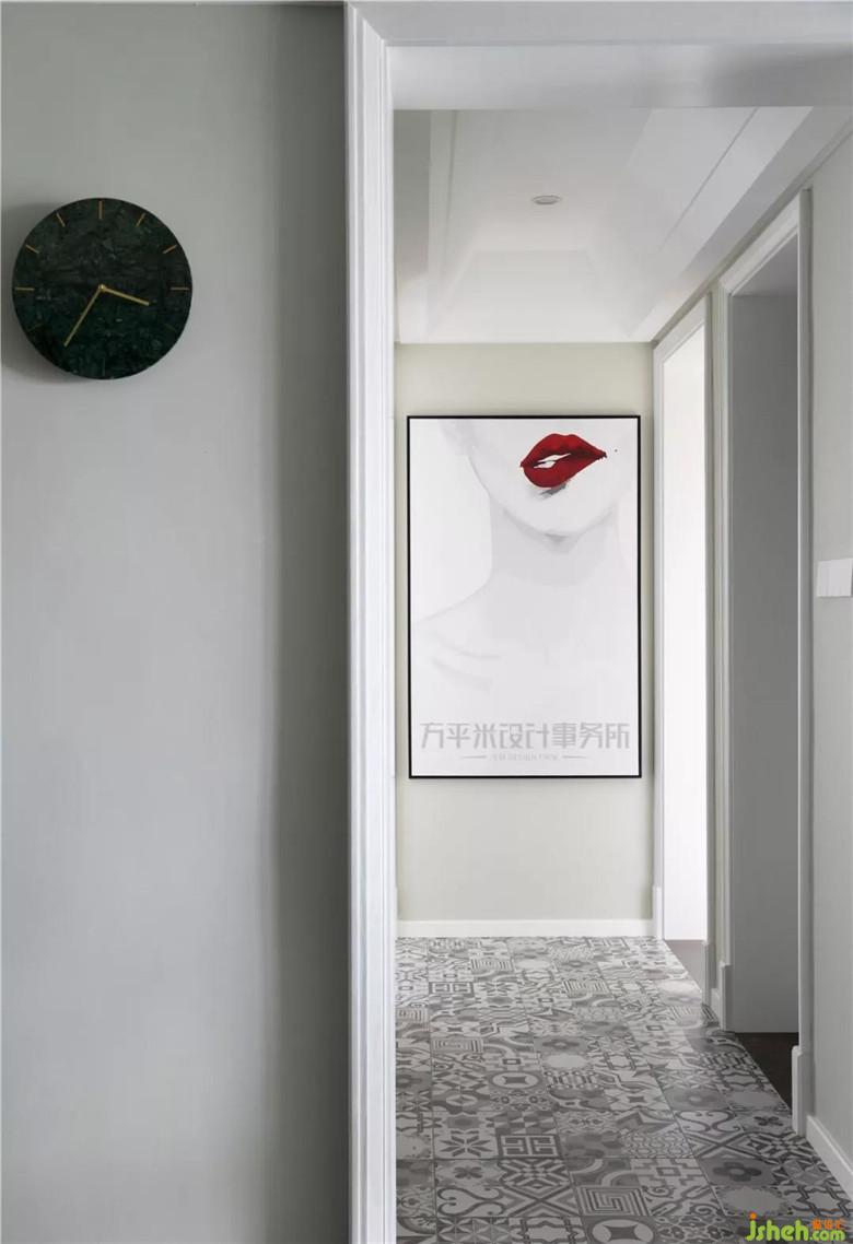 走廊的水泥花磚點(diǎn)綴,由會(huì)客起居空間步入臥室私密區(qū)域作出過(guò)渡。干濕分離的衛(wèi)生間,于洗手臺(tái)干區(qū)墻面制作木質(zhì)嵌入式置物柜,便利收納。