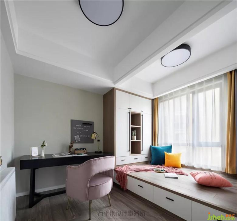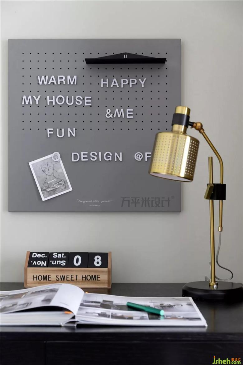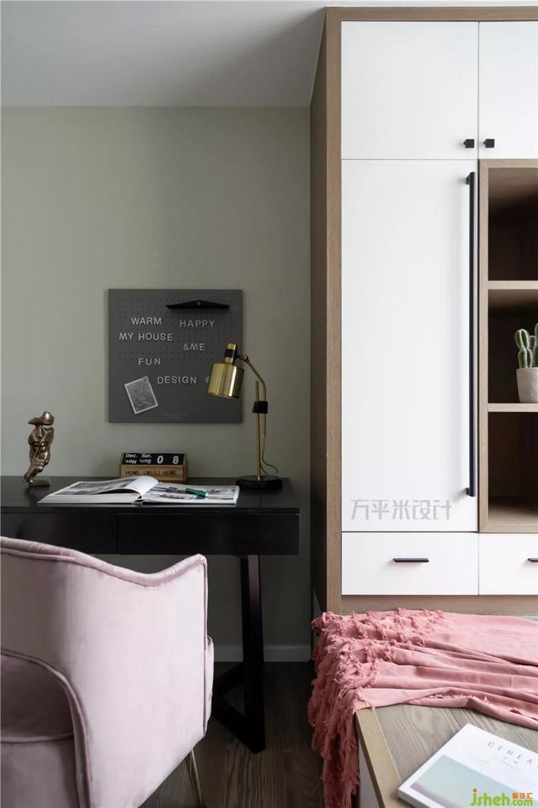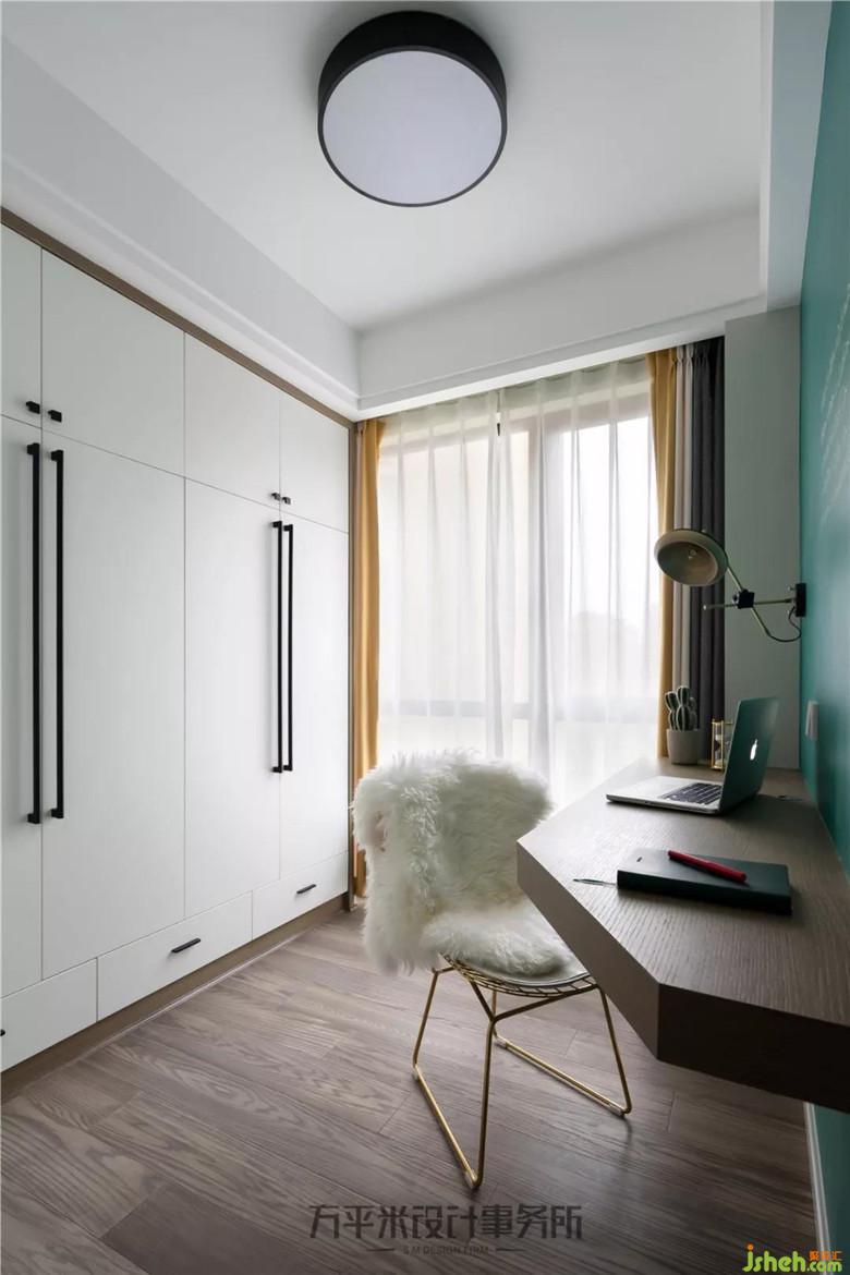 面積不大的書(shū)房,需要在必要時(shí)刻充當(dāng)業(yè)主媽媽來(lái)小住時(shí)的臥室,我們?cè)诳看耙粋?cè)設(shè)置了儲(chǔ)物式榻榻米與置物柜的組合,平時(shí)可以隨意的在地臺(tái)上看書(shū)或是玩耍,如果以后業(yè)主有了寶寶,這間房也可以變成兒童房。置物柜中部留空的開(kāi)放式設(shè)計(jì),使柜體處的空間感未受壓縮。書(shū)桌處墻面的網(wǎng)紅金屬洞洞板,可以根據(jù)自己需求增加層板放些小擺設(shè)或小工具。