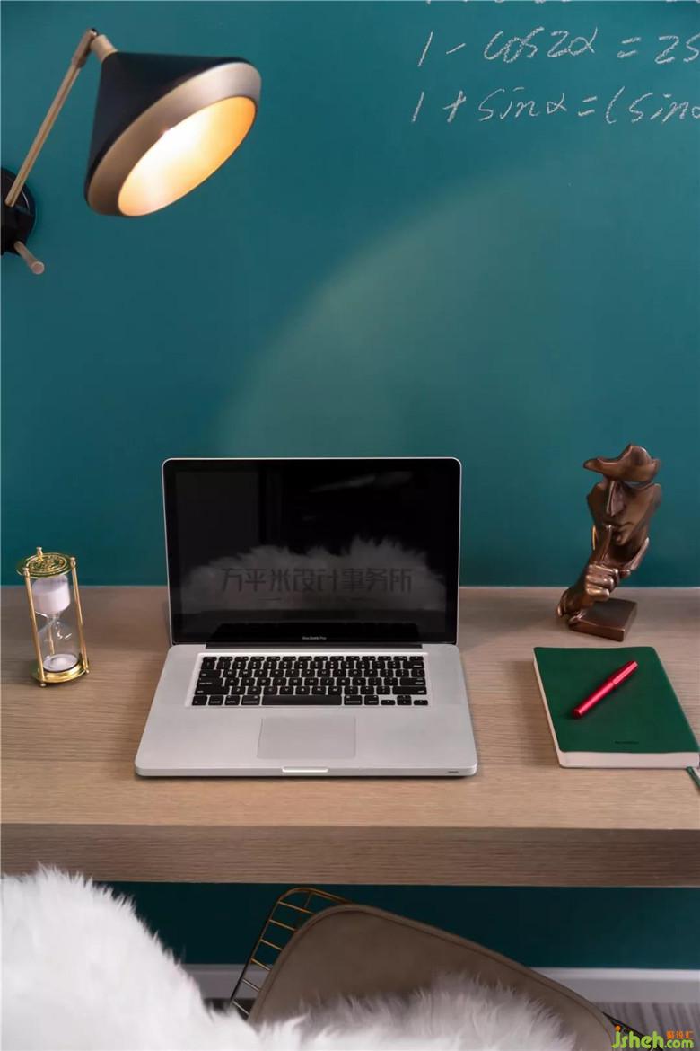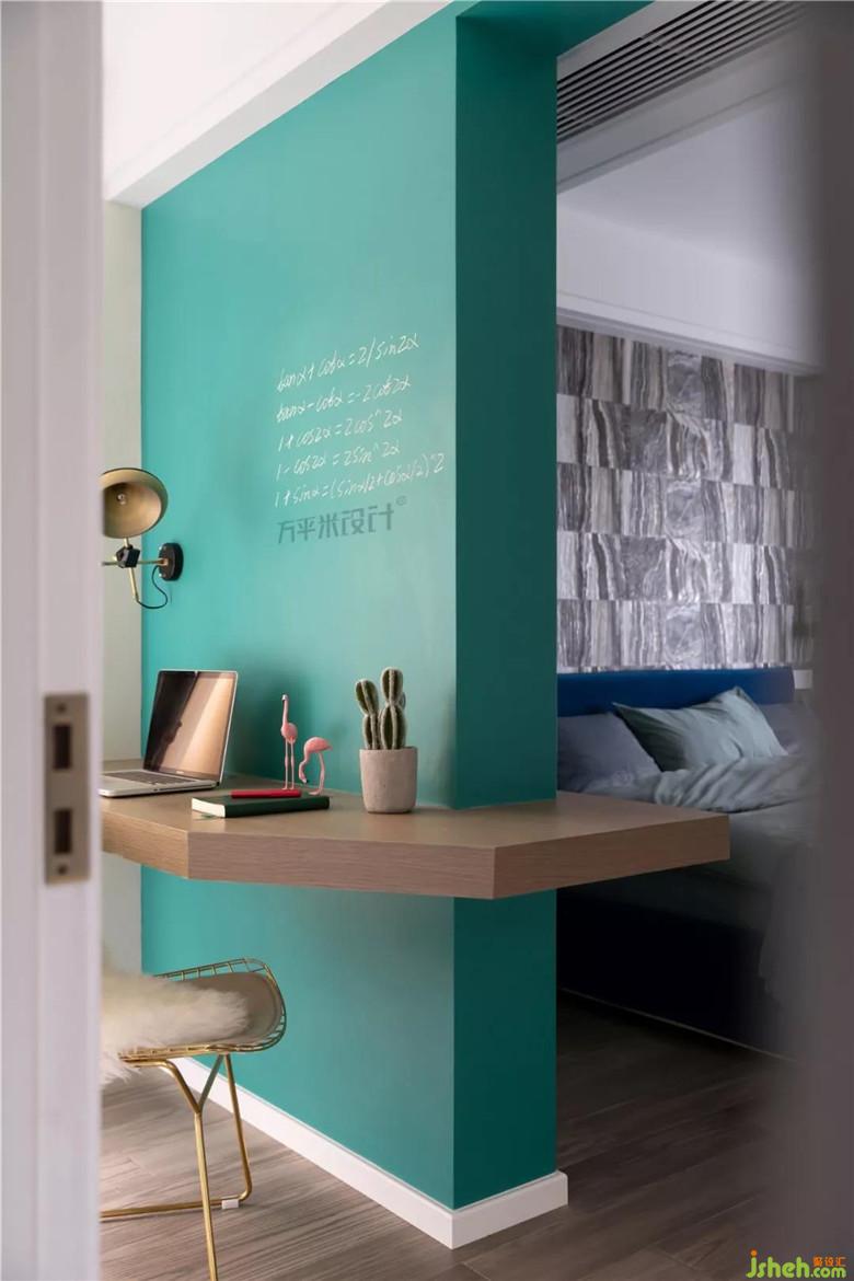 兩面都是承重墻的小面積空中花園,將原入口封閉,并入主臥內(nèi)成為開(kāi)放式衣帽間及化妝間。利用落地采光窗明亮光線,提升主臥整體采光。衣柜移至衣帽間內(nèi)進(jìn)行儲(chǔ)物,釋放了原本屬于臥室的空間尺寸。無(wú)法拆除的承重墻體,涂刷上與客餐廳一致的綠色黑板漆,并在靠墻兩側(cè)制作木質(zhì)固定桌面,成為方便的小桌臺(tái),可供讀寫(xiě)或化妝。