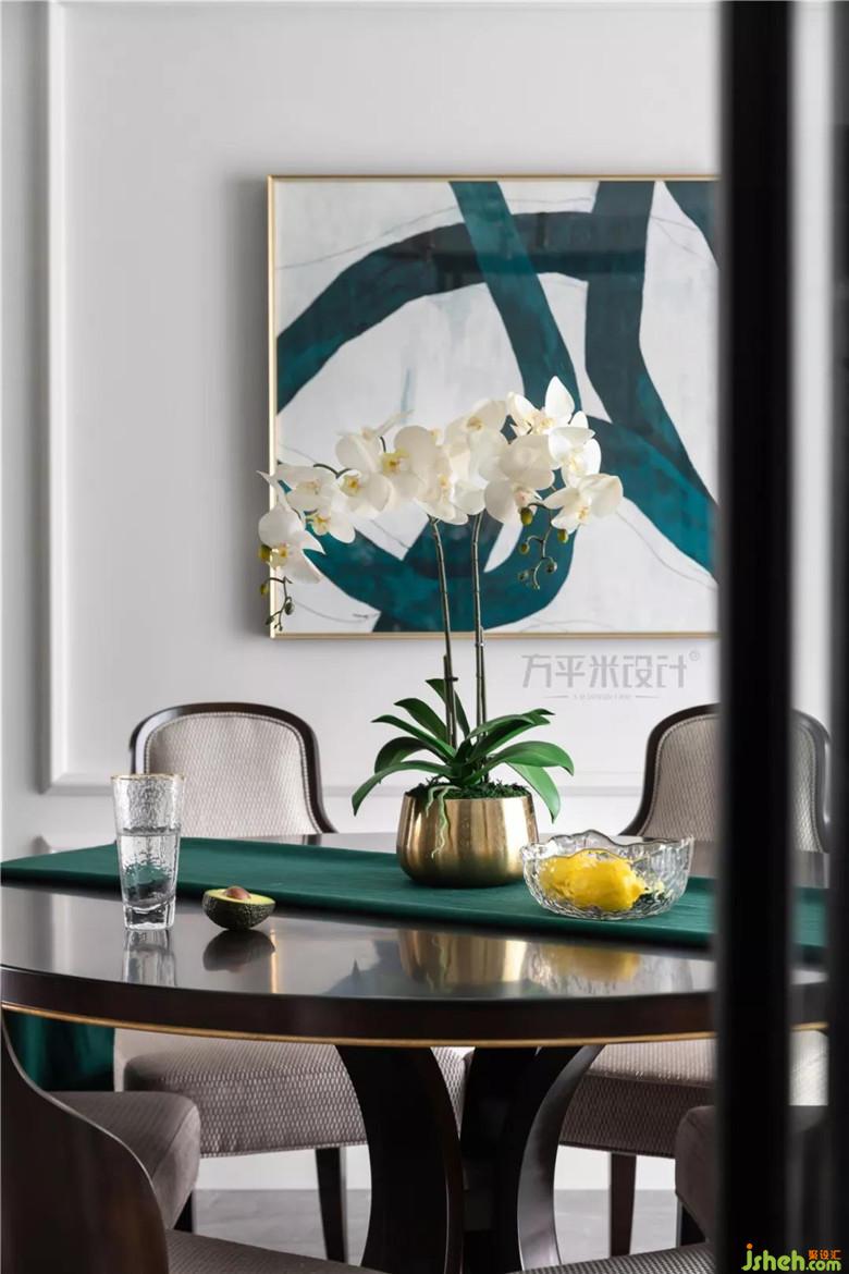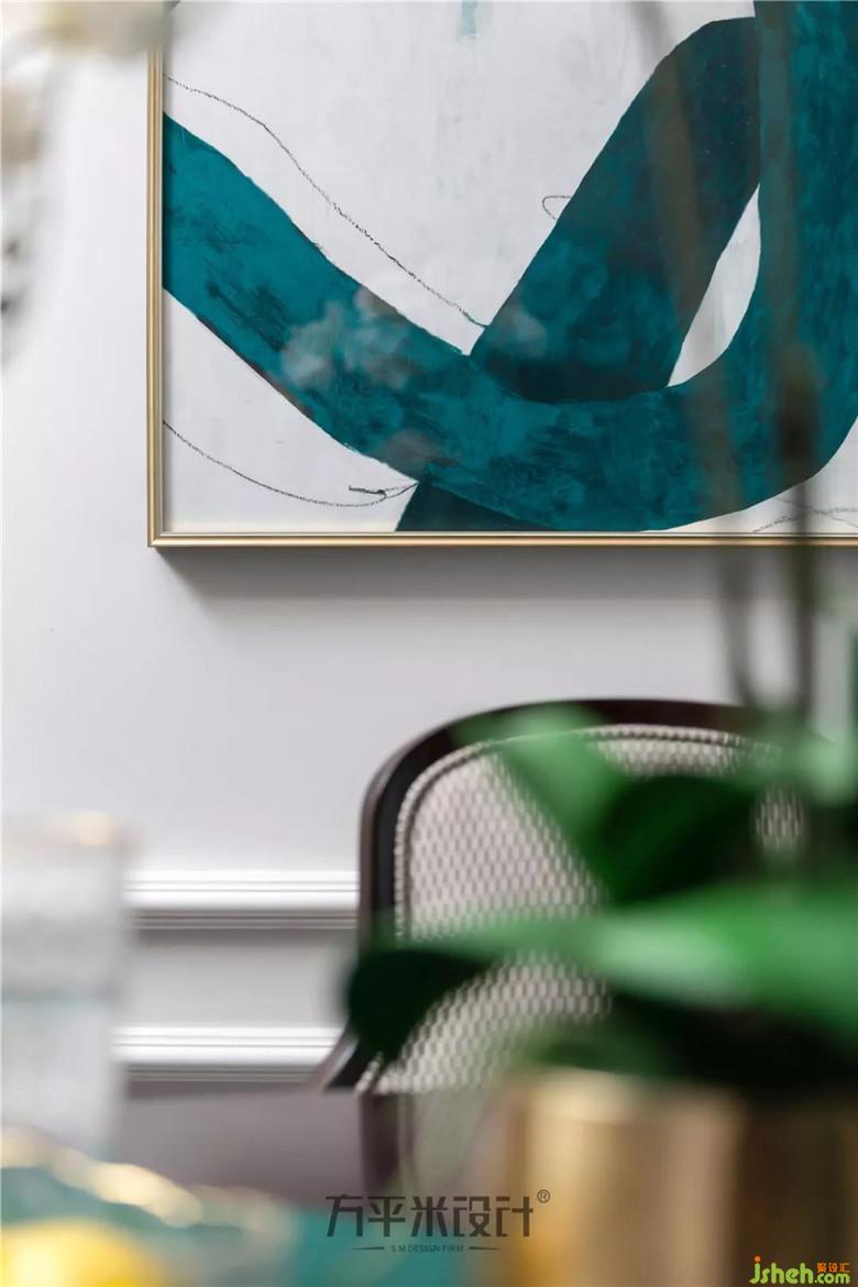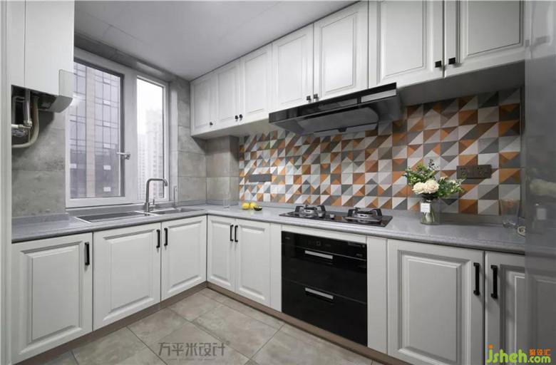 廚房洗切炒盛的動(dòng)線設(shè)置合理。少許加長(zhǎng)的廚房隔墻將對(duì)開門冰箱嵌入,更為美觀。
