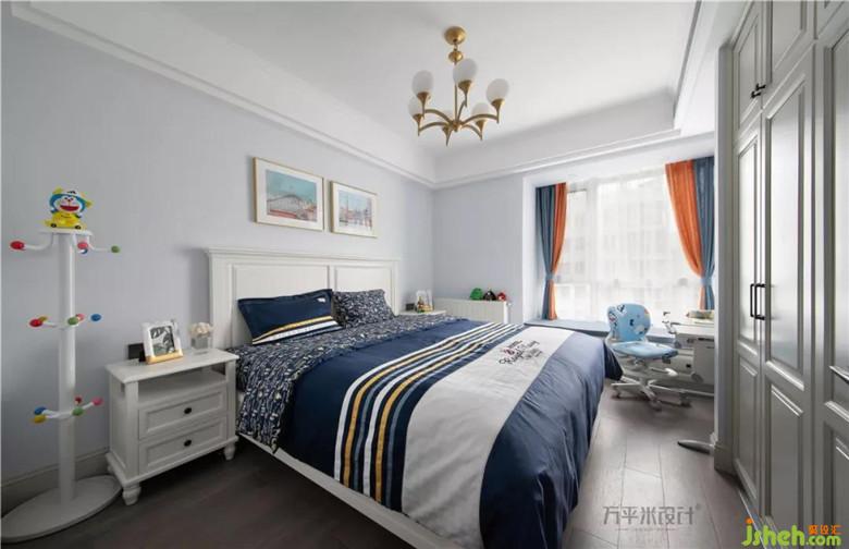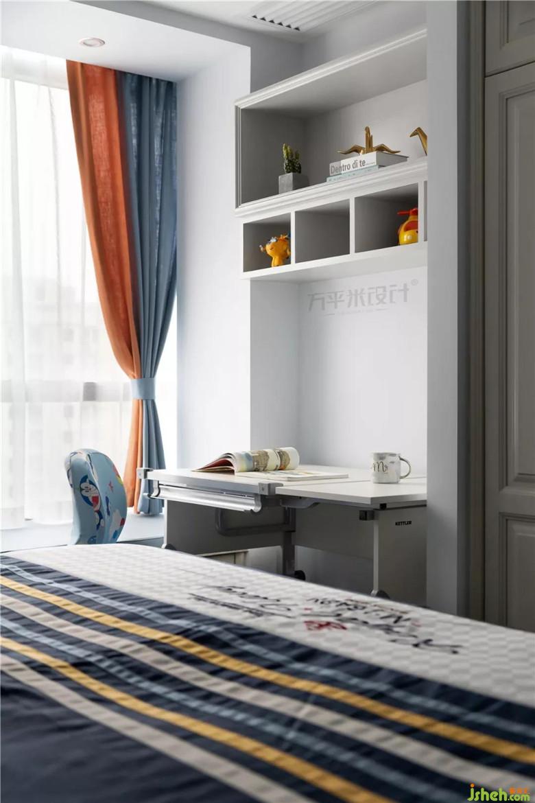 兒童房不同于其他房間,為男孩子選用了更為明快的淡藍(lán)色墻面,利用原有的設(shè)備平臺(tái)外拓,設(shè)置出可供小憩的飄窗。為成長(zhǎng)中的孩子所使用的活動(dòng)式升降桌椅預(yù)留出位置,并有固定吊柜方便置物。