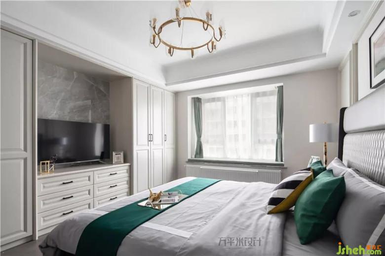 輕柔色澤令臥室更為溫馨舒適,床尾一側(cè)滿墻儲(chǔ)物衣柜提升收納,中部留空設(shè)置電視柜,使縱向空間感保留、更為通透。