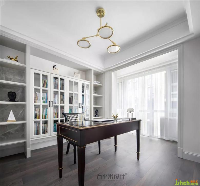 北側(cè)主臥套間內(nèi)書房,小陽(yáng)臺(tái)并入屋內(nèi)提升光線及擴(kuò)大室內(nèi)面積,半開放式書柜保留整面墻的空間感。