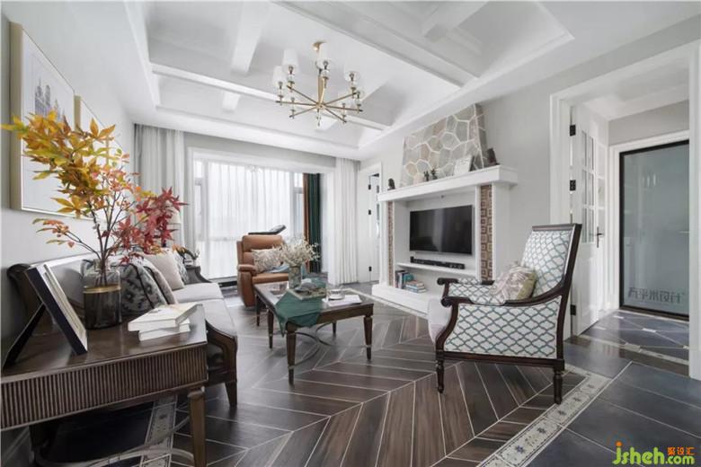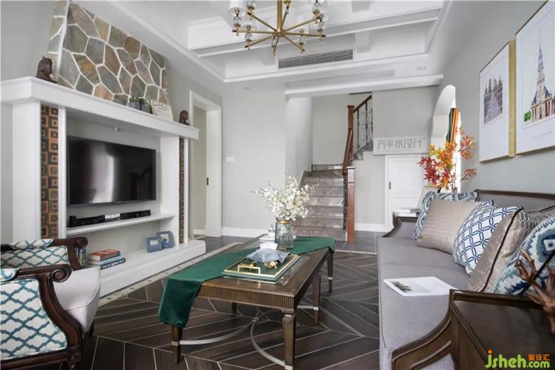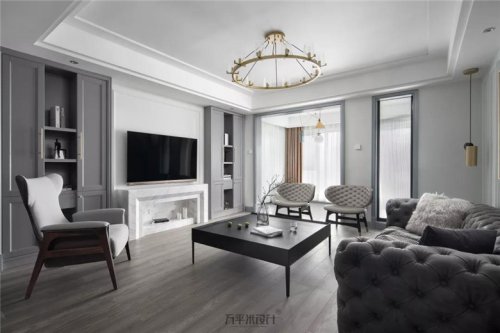 電視背景采用壁爐造型,將電視嵌入其中。聯(lián)動兩邊門洞,形成整體背景,簡單而又不失格調(diào)。