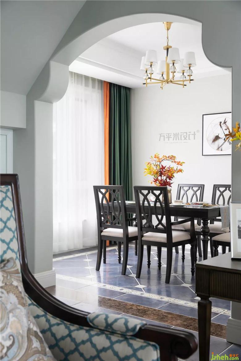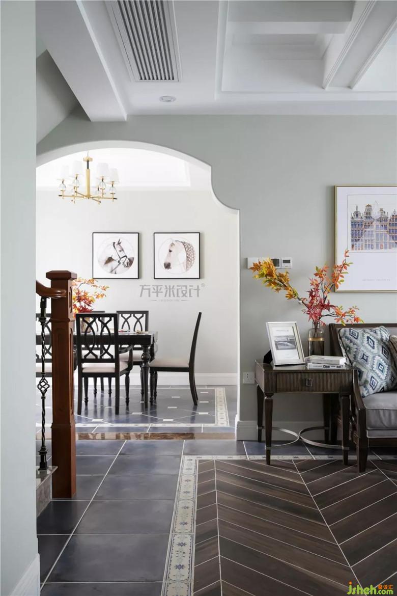 客廳與餐廳之間制作拱形門洞,使客廳與餐廳既獨(dú)立,又相互關(guān)聯(lián)。同時(shí),也解決了樓梯踏步底部的斜面角度問題。