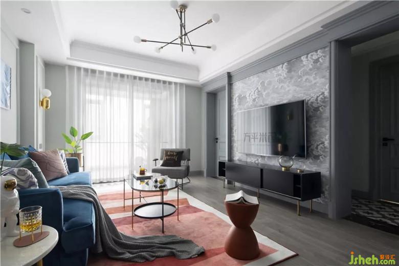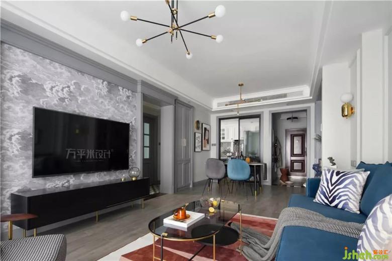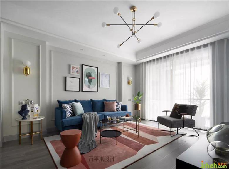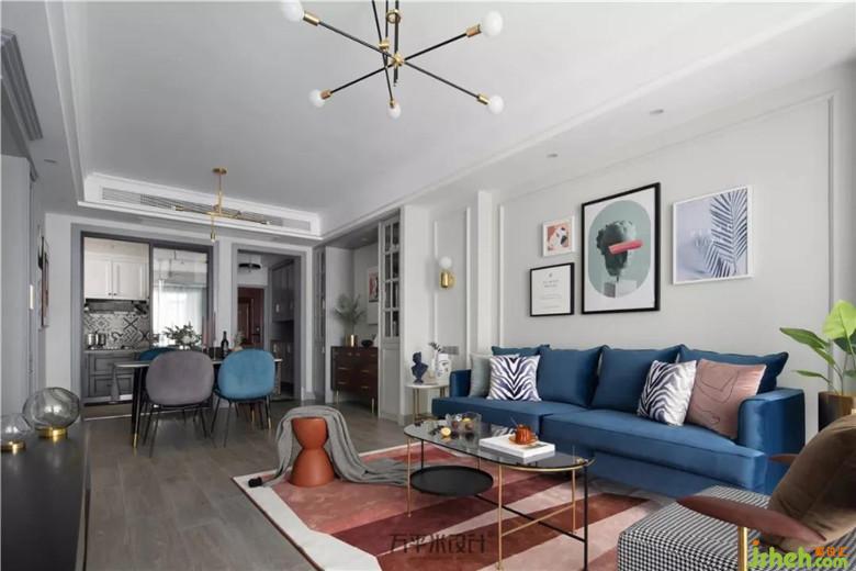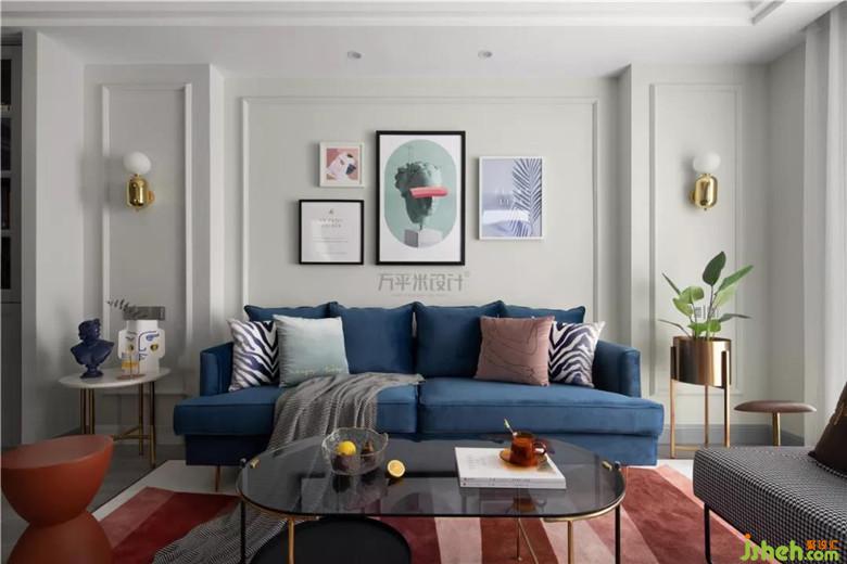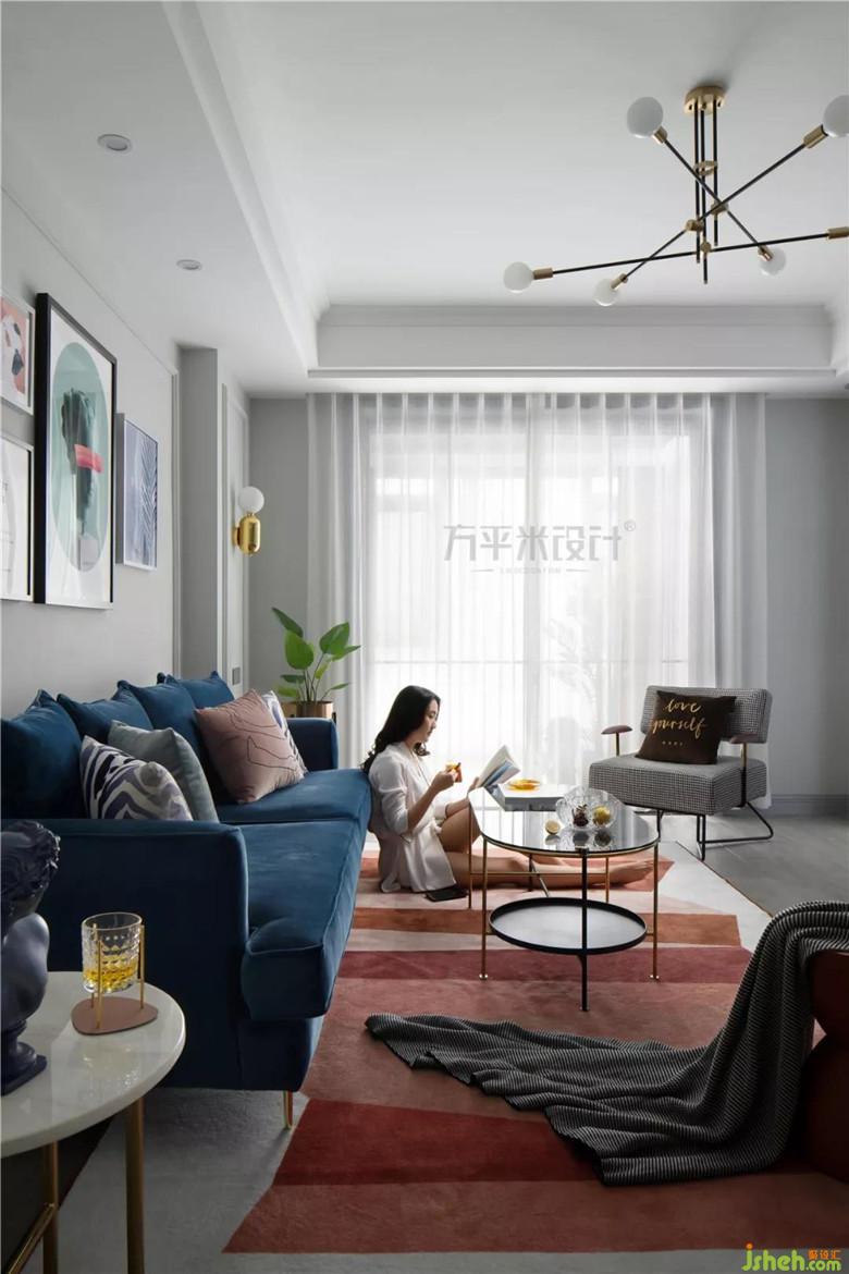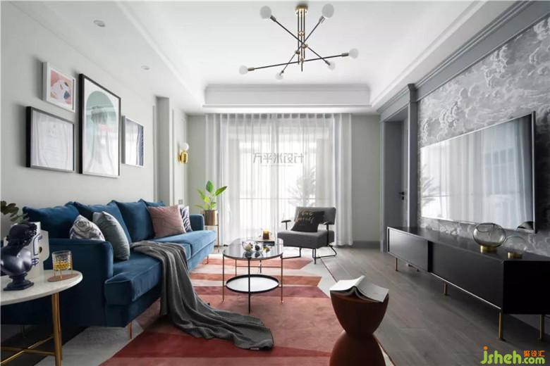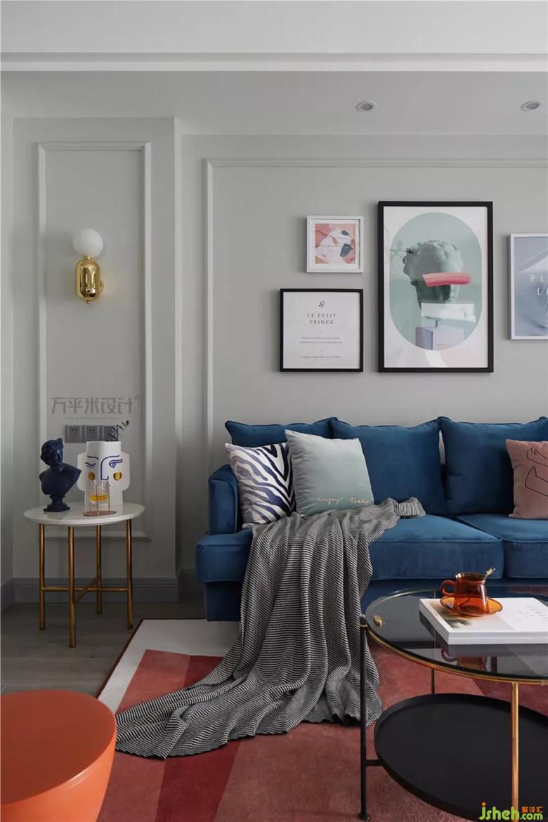 撞色的靛藍(lán)絲絨沙發(fā)與磚紅地毯,觸感細(xì)膩溫柔,隨意而放松。色彩躍動(dòng),成為空間亮點(diǎn)。復(fù)古的千鳥格單椅,相映成趣。主臥入口調(diào)整至電視墻一側(cè)后,設(shè)計(jì)師將其與走廊門洞形成整體、做出具有層次的造型。調(diào)整尺寸后使電視墻面與沙發(fā)背景得以居中對(duì)稱。簡約的線框墻面圍合沙發(fā)主位,特意選用不對(duì)稱的組合畫作裝點(diǎn),營造隨意無拘的輕松感。輕盈的茶幾及邊幾的選擇,從體量上釋放客廳空間。使令會(huì)客區(qū)域更顯通透舒適。