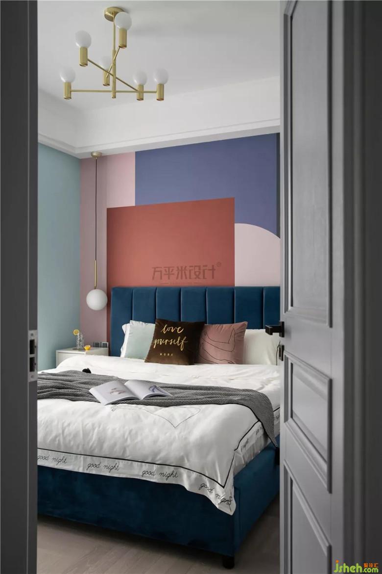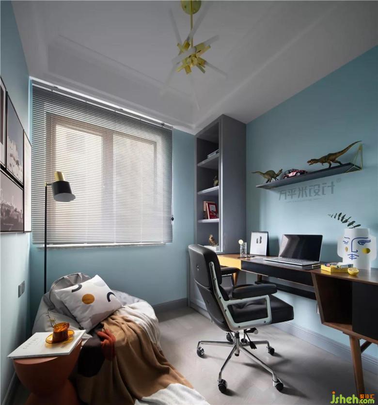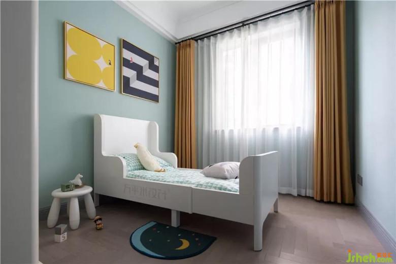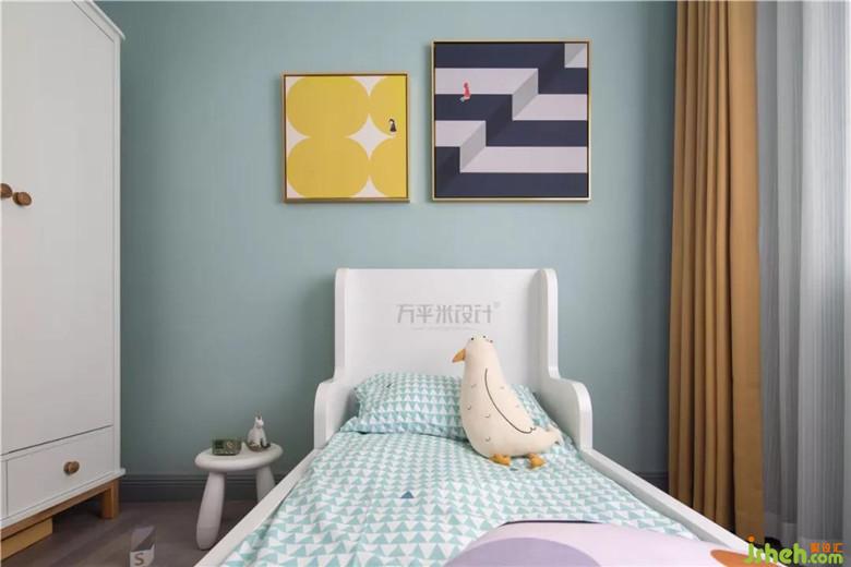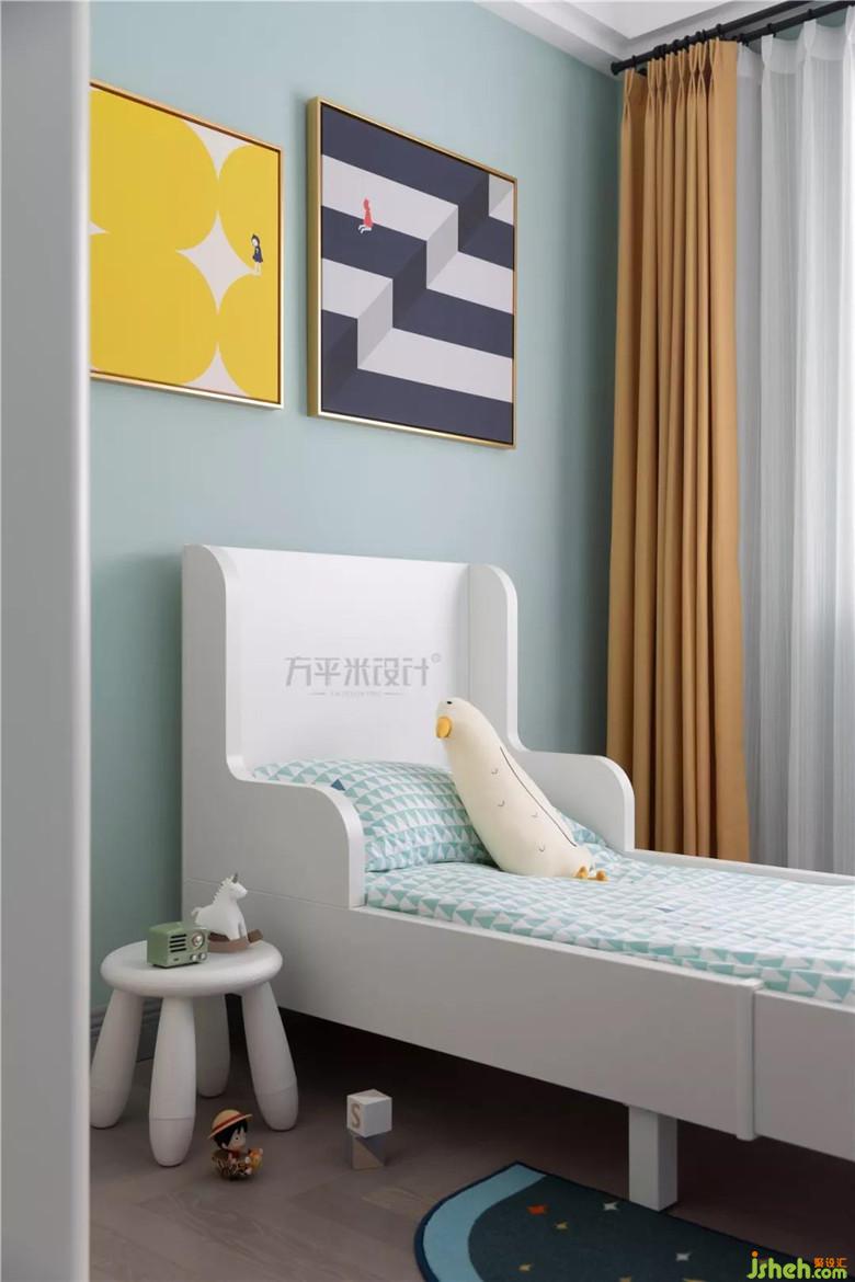 兒童房選用更加明亮的墻色,用明黃溫柔相搭,展示童趣天真的一面。幾何紋理的軟裝也從色彩上互為呼應(yīng)。選用邊角圓潤的兒童專用家具。細(xì)心呵護(hù)寶貝的成長之路。