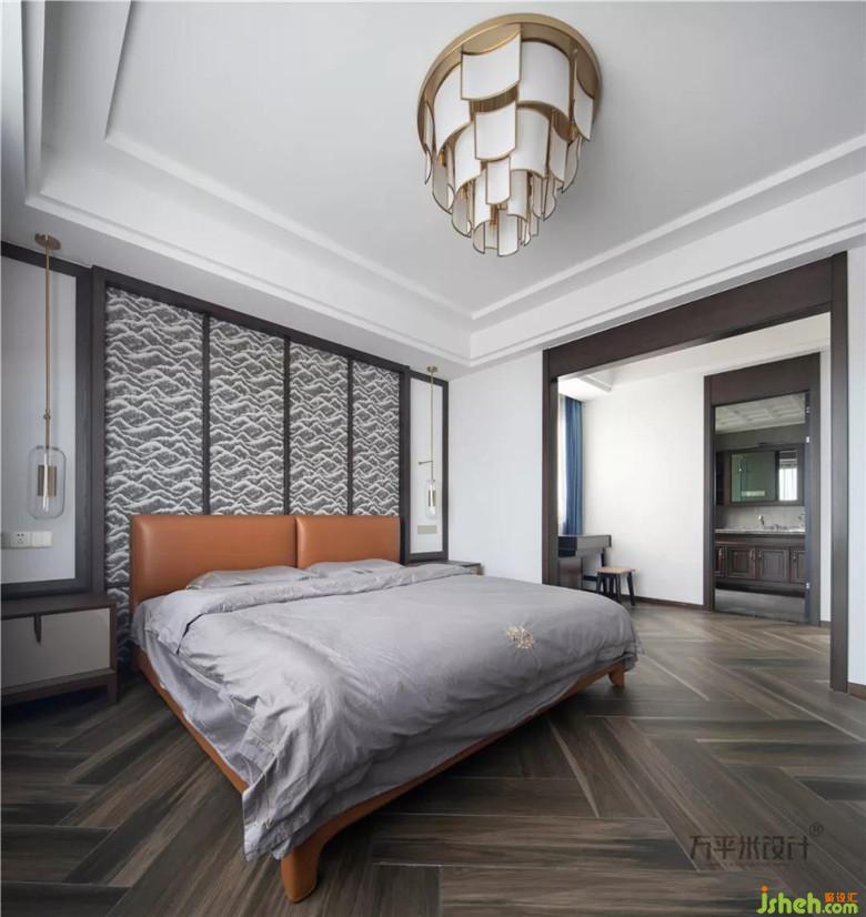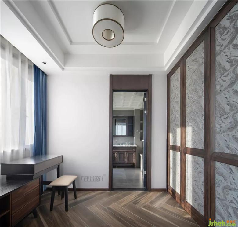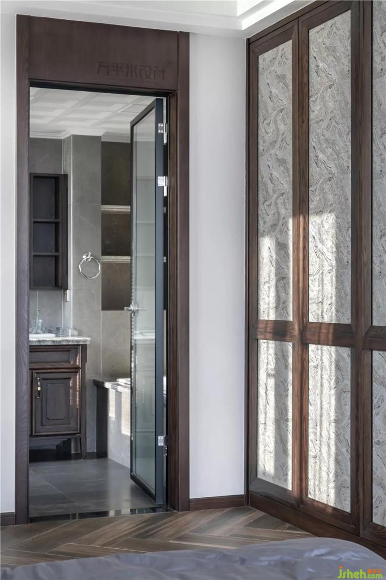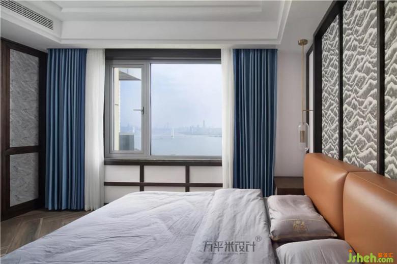 山紋圖樣的布料選擇,取依山傍水的寓意。床尾一側(cè)采取滿墻儲物衣柜來提升收納功能。窗外開闊江景一覽無余。清晨的陽光溫柔灑落,落日的余暉由水面侵染。開放式衣帽間作為主臥空間的延展成為統(tǒng)一的空間,明亮靠窗一側(cè)設(shè)計為梳妝臺。