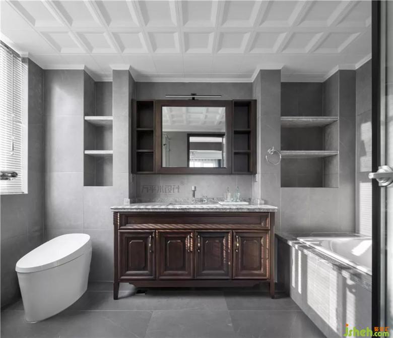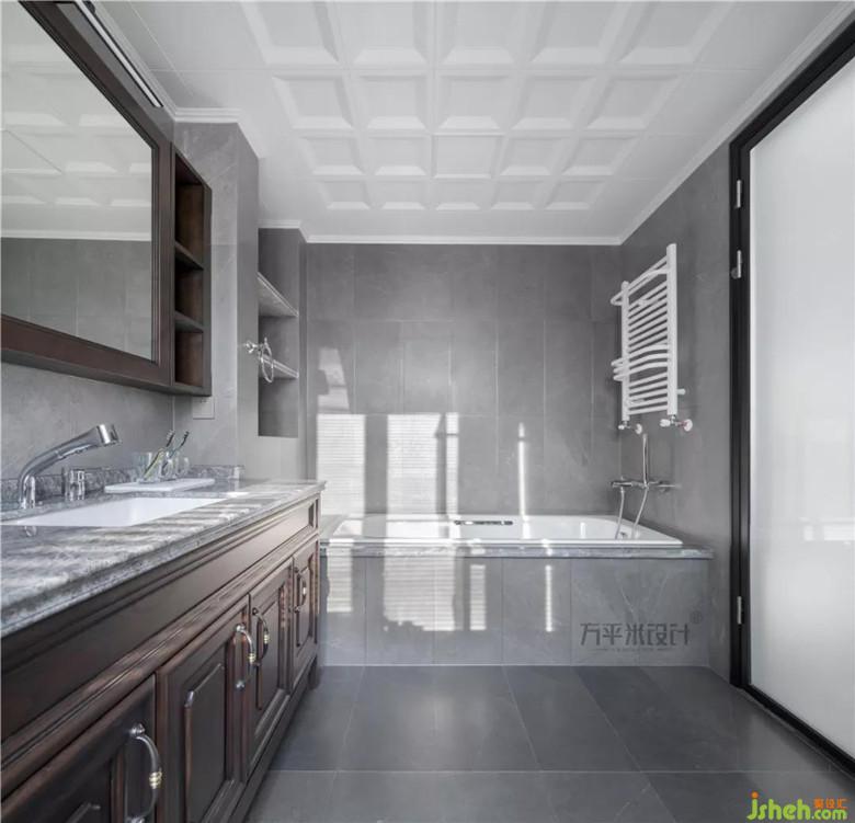 借用部分衣帽間空間后,主衛(wèi)從容安放淋浴房,浴缸,坐便,洗漱臺四大功能分區(qū)。利用包管厚度,設(shè)置出便于打理的大理石層板置物。定制的浴室柜及鏡柜內(nèi)嵌于墻面厚度內(nèi)。