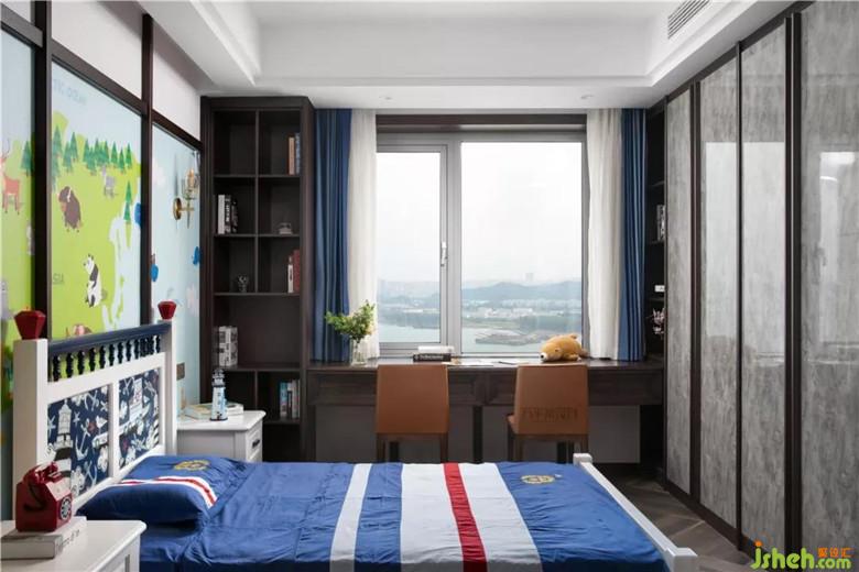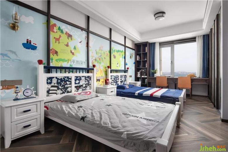 為兩個(gè)即將入學(xué)的小學(xué)男生準(zhǔn)備的寬敞兒童房。適時(shí)加入童趣元素,有孩子氣的天真??看耙粋?cè)制作可容雙人同時(shí)書寫的長條書桌。兩側(cè)分別設(shè)置開放式書架。方便拿取。床尾一側(cè)的滿墻衣柜,足以收納成長中孩子的衣物。