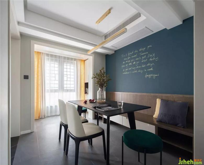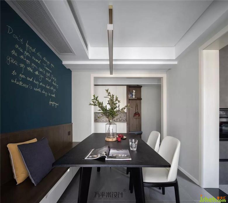 餐桌的墨色巖板臺(tái)面采用了耐腐蝕和高溫的火燒石,搭配墨綠色的絨面圓凳和奶白色的皮凳,與黑板墻的色彩在空間上充滿韻律和層次,薄款黃銅長(zhǎng)條燈將餐廳空間的橫豎結(jié)構(gòu)再次拉伸過(guò)渡,游刃有余。
