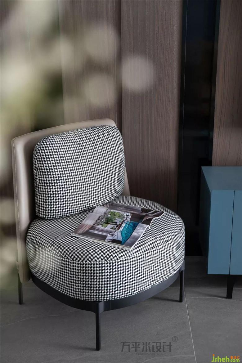 客廳采用了無主燈式的設(shè)計(jì),讓整體的層高往上延伸,不壓迫僅有的層高視覺感。石膏吊頂上分布著筒燈作為主光源,白色的跳舞蘭旁一盞黃銅吊燈垂落,中性而又低奢的黃銅拉絲飾品作為點(diǎn)綴,融入代表著時(shí)尚感的千鳥格圓凳。