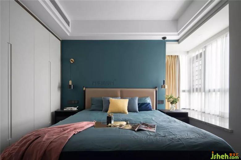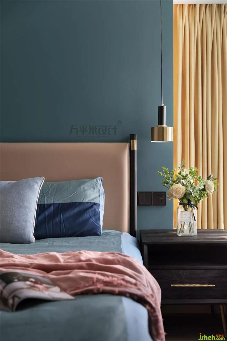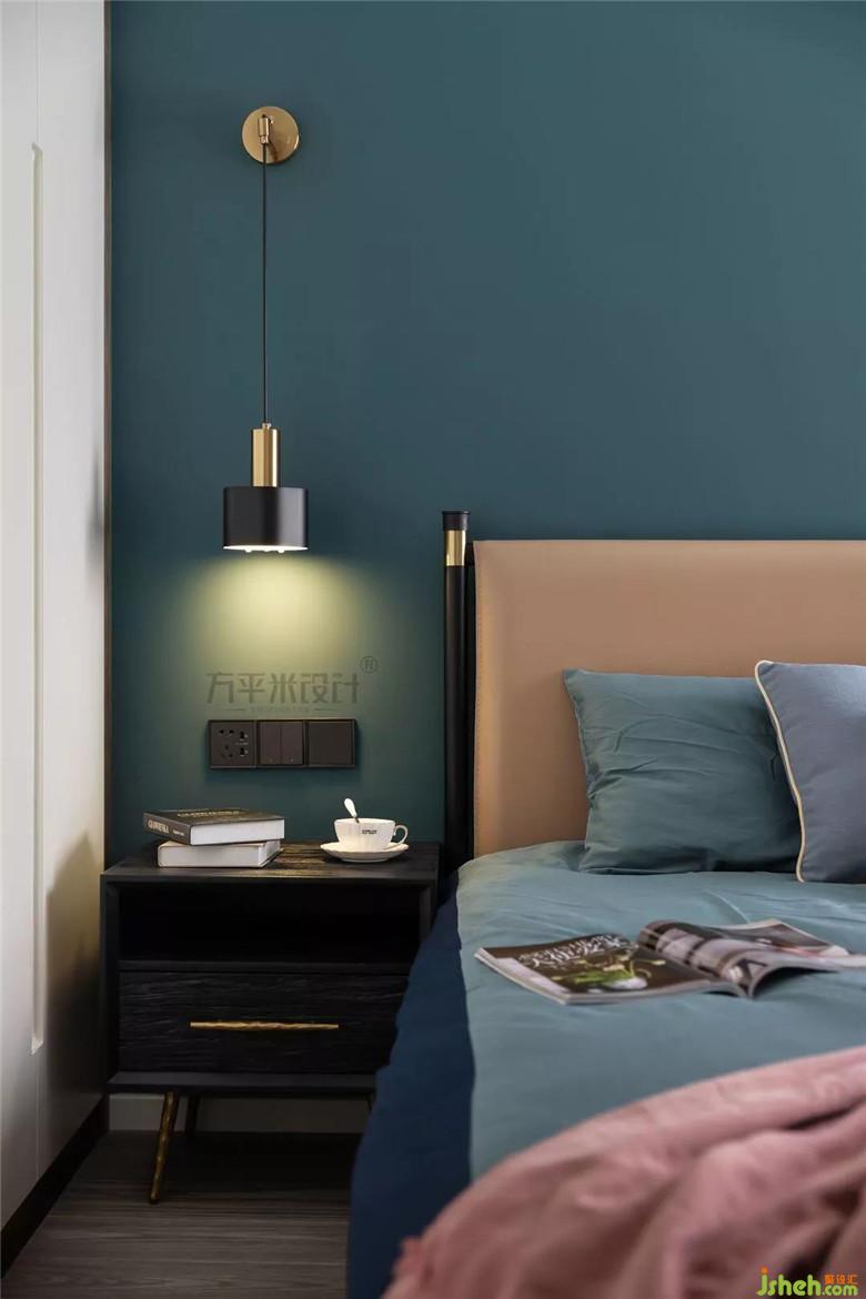主臥也延續(xù)整體的主色調,簡練而不失溫馨。左右不對稱的壁燈和吊燈,打破了中規(guī)中矩的平衡,讓照明也能充滿格調。作為睡眠區(qū),墻壁大膽的色彩運用,最開始讓設計師有些許忐忑,但是屋主的無條件信任,讓所有的不安,在這里找到別具一格的歸屬。