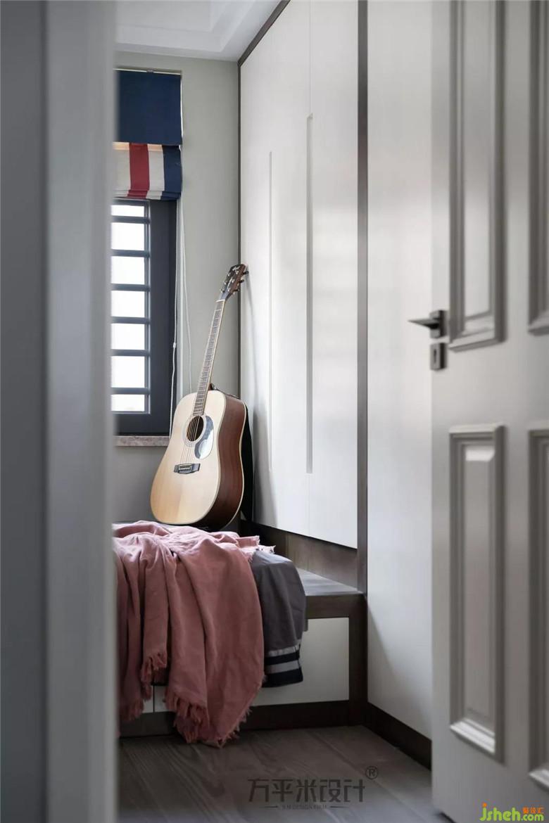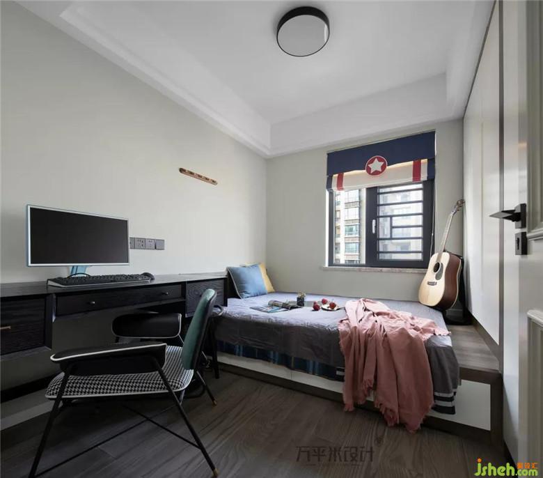 小孩房以榻榻米的形式呈現(xiàn),盡量表達(dá)出放松的姿態(tài),無拘無束。另外,考慮到了孩子長大的學(xué)習(xí)功能性需求,提前設(shè)置好了書桌。整套房子所有的衣櫥柜門拉手都采用了無拉手設(shè)計(jì),暗槽拉手避免了孩子日常磕碰危險(xiǎn)。 一把夫妻倆所鐘愛的吉他在窗邊靜靠,搭配美國隊(duì)長的窗簾,在這樣充滿童真的空間里,勇敢而可愛的小菠蘿一定會(huì)茁壯成長吧。